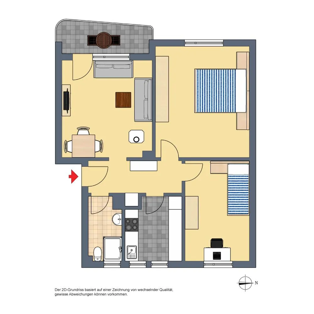 Der Grundriss der Wohnung ist gut: alle Räume sind direkt vom Flur begehbar. Der ca. 5 m² große und überdachte West-Balkon mit Markise ist vom Wohnzimmer begehbar. Das Badezimmer verfügt über ein Fenster.