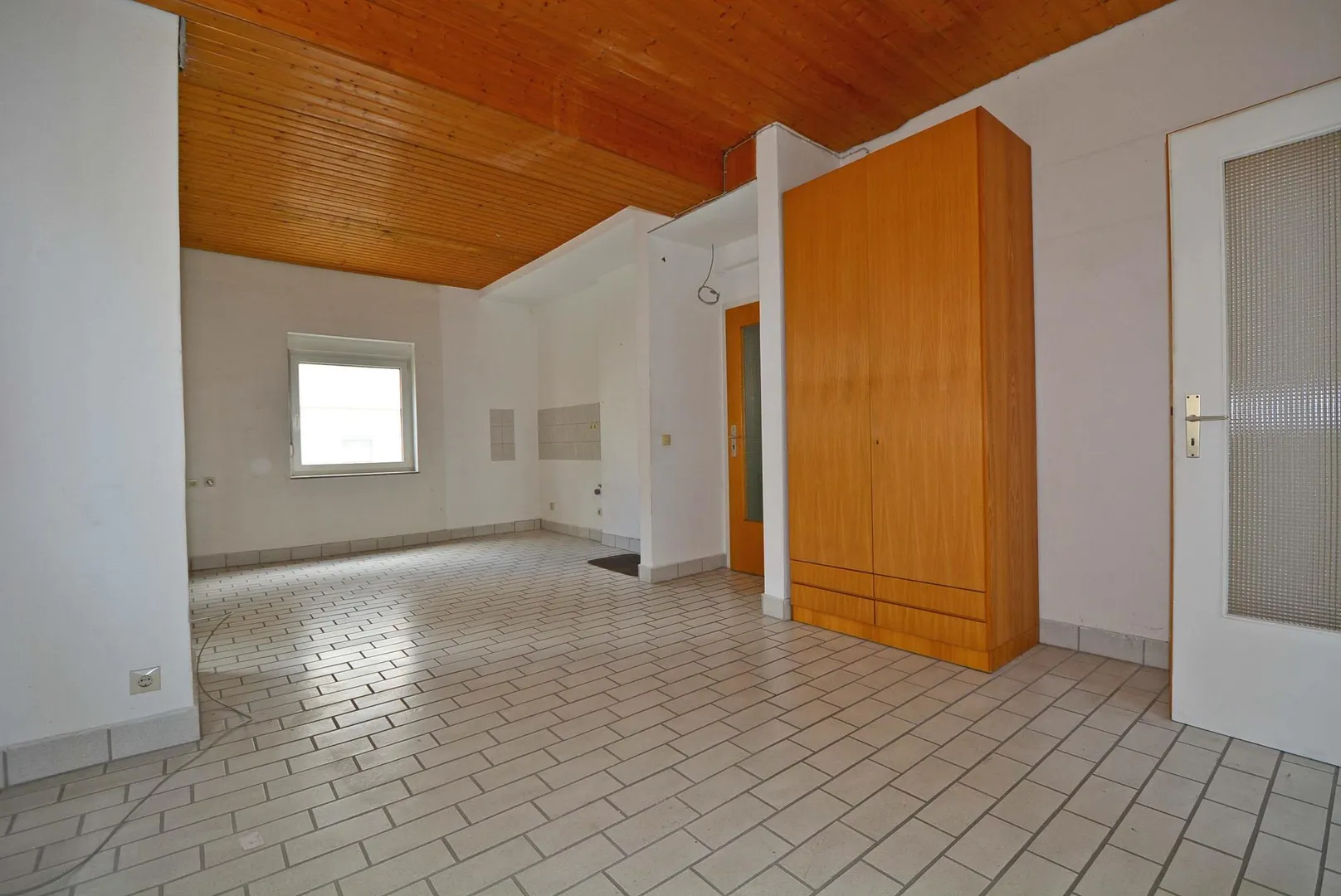 Der Gemeinschaftsraum mit offener Küche ist mit einem Einbauschrank sowie einer braunen Holzdecke ausgestattet.
