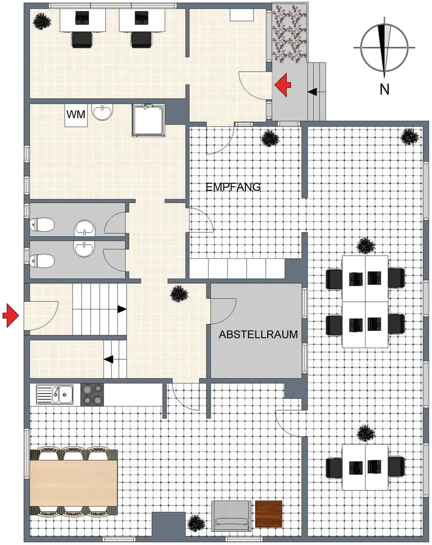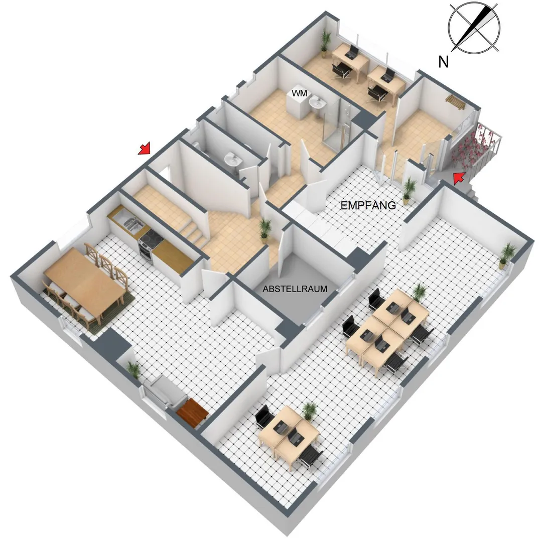 Das Büro ist aufgeteilt in einen Windfang, ein Chef-Büro, ein großes Büro, ein Gemeinschaftsraum mit Küche, ein Bad sowie zwei getrennte WCs.