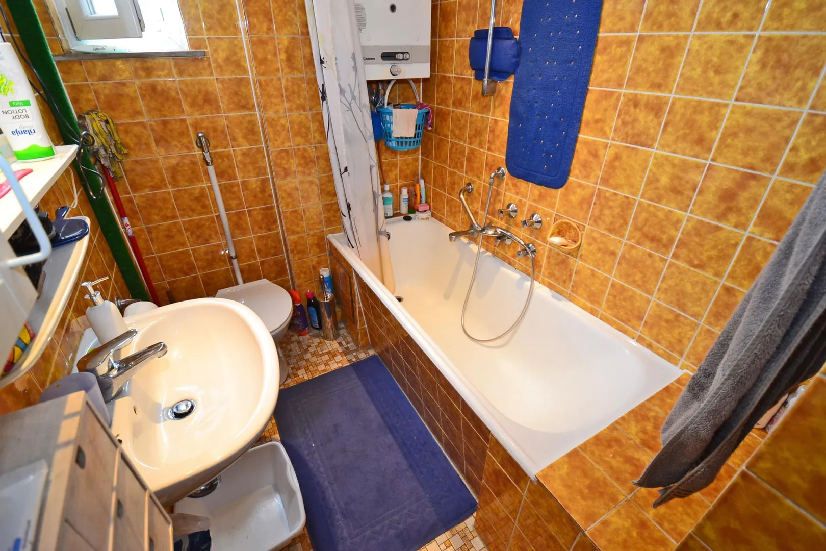Das halbhoch geflieste Tageslicht-Badezimmer mit abgehängter Halogendecke verfügt über eine Badewanne, einen Durchlauferhitzer sowie ein WC.
