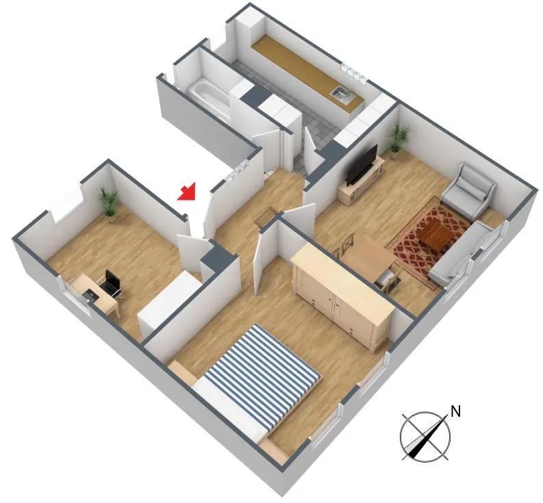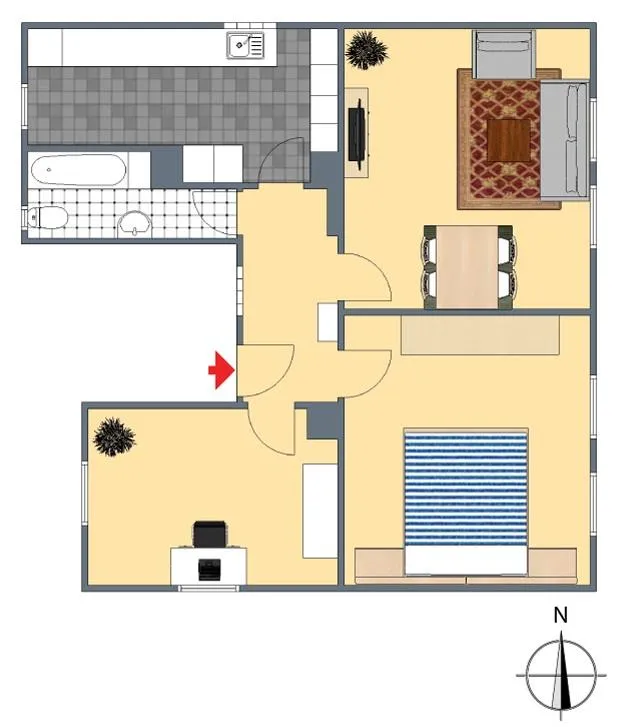Alle Räume sind vom Flur aus zugänglich. Das Badezimmer ist mit einem Fenster ausgestattet.