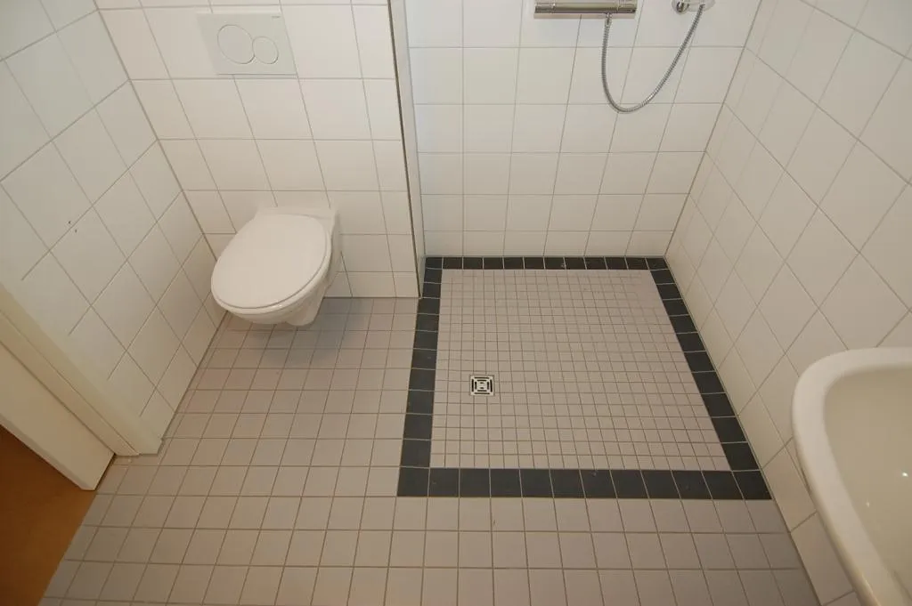 Das raumhoch geflieste Badezimmer verfügt über eine bodentiefe Dusche sowie ein WC.