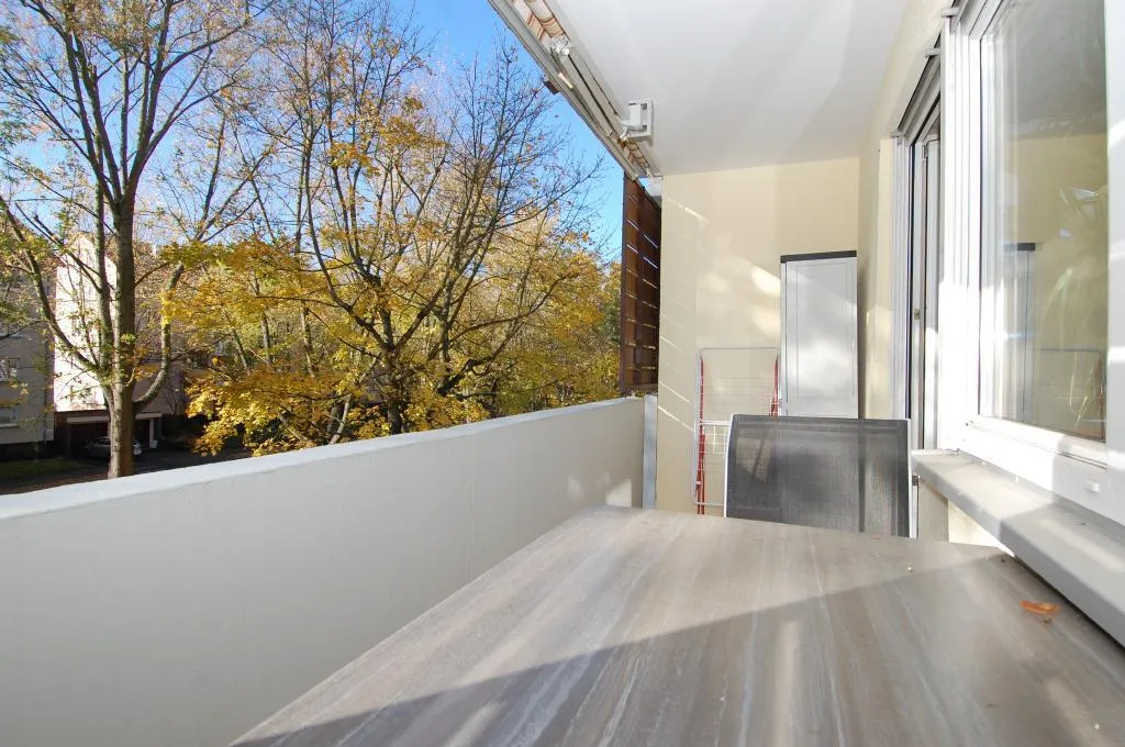 Der sonnige Süd-Balkon ist überdacht; als Sonnenschutz ist eine Markise angebracht.