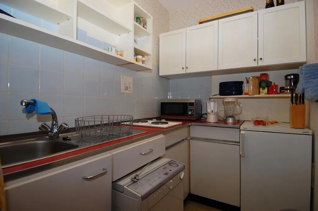 Die Küche ist zum Wohnbereich hin offen und mit 2-Platten-Herd, Kühl-/Gefrierschrank, kompakte Waschmaschine (Toplader) sowie Ober- und Unterschränken ausgestattet. Ein Backofen ist nicht vorhanden.