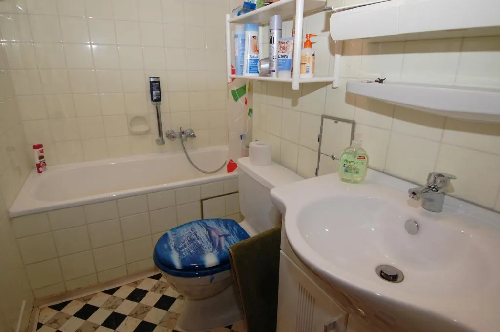 Das Bad ist halbhoch gefliest und mit Kunststoffboden, Badewanne und WC sowie Spiegelschrank und Waschtisch-Unterschrank ausgestattet.