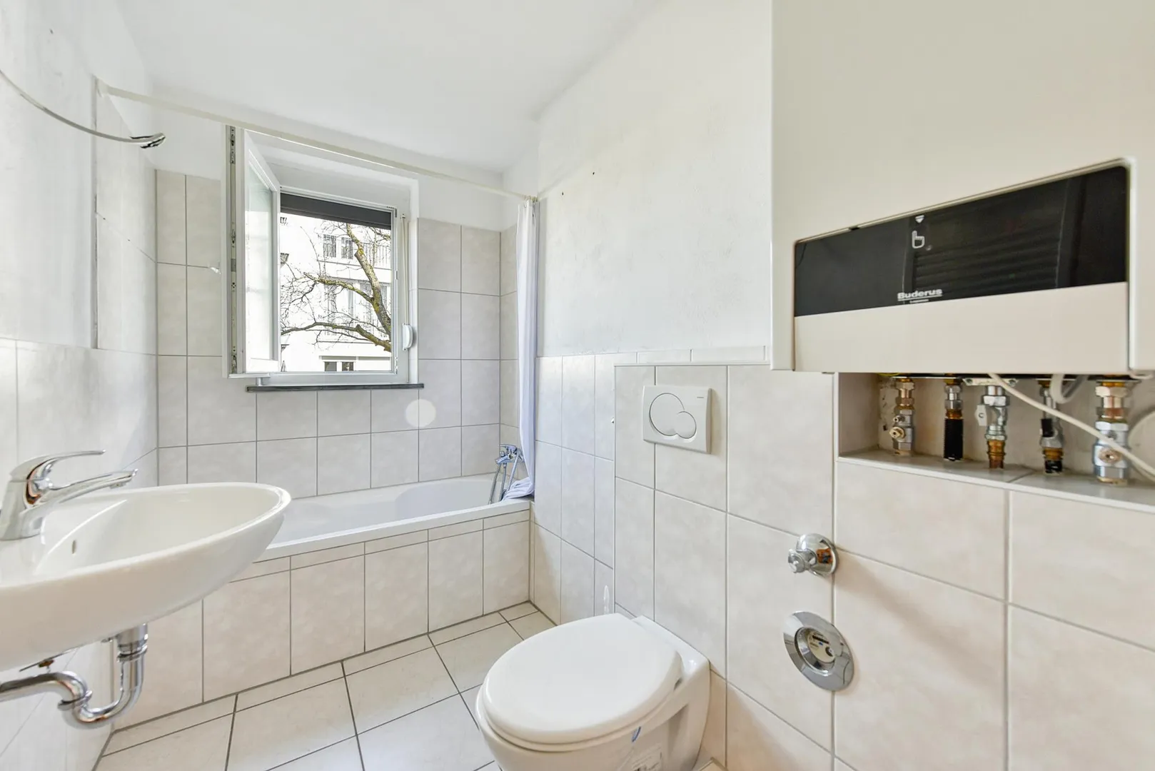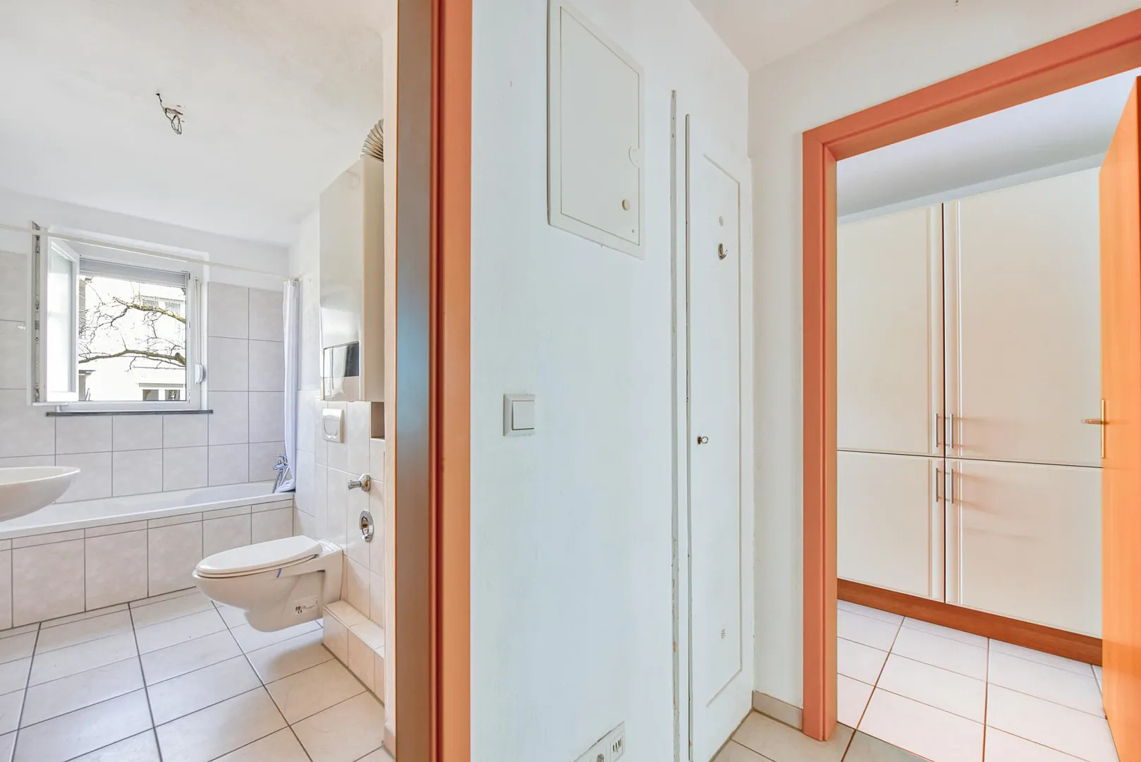 Das teilweise 2/3-hoch und halbhoch geflieste Tageslicht-Badezimmer verfügt über eine Badewanne, einen Handtuch-Heizkörper, ein WC sowie einen Waschmaschinen-Anschluss.