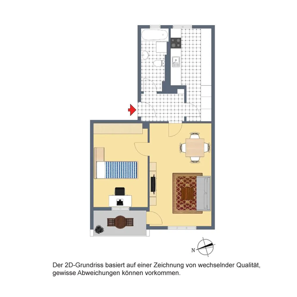 Der Grundriss ist gut. Der ca. 4 m² große und überdachte West-Balkon ist über das Wohnzimmer begehbar. Das Schlafzimmer ist ebenfalls über das Wohnzimmer begehbar. Das Badezimmer verfügt über ein Fenster.