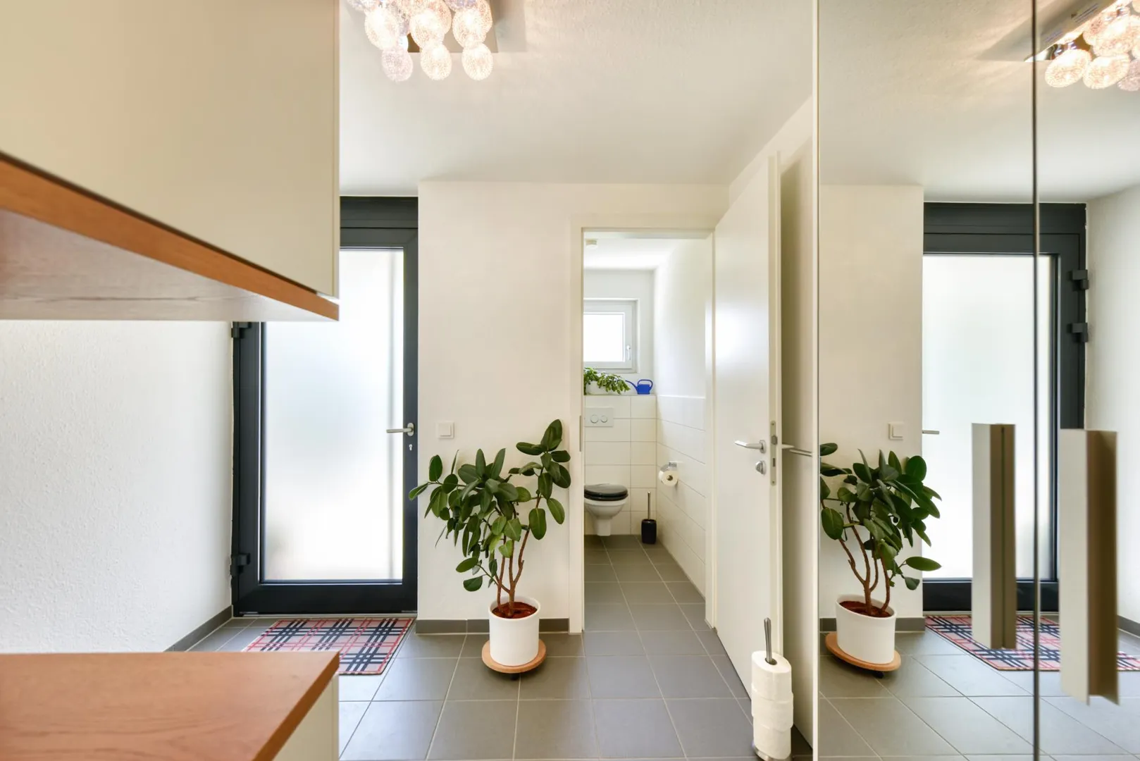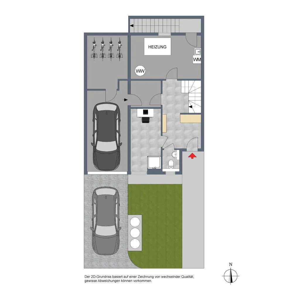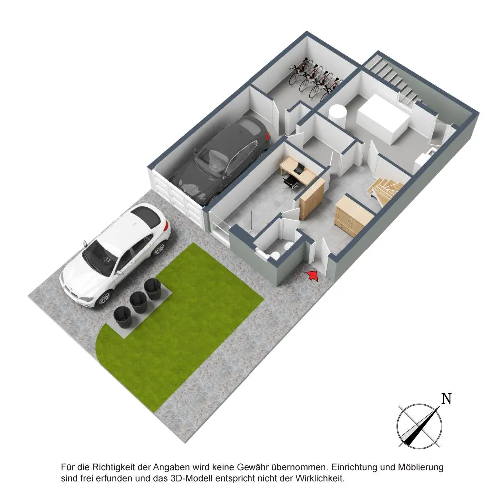 Im Eingangsgeschoss befinden sich eine im Haus integrierte Garage mit direktem Hauszugang, einem Stellplatz davor sowie einem Abstellraum im rückwärtigen Garagenbereich, der Hauseingang mit einer Diele, ein Gäste-WC mit Fenster, ein Arbeitszimmer mit einer Dusche sowie ein Technik-/Wasch-/Abstellraum mit direktem Außenaufgang in den Außenbereich des Terrassengeschosses.
