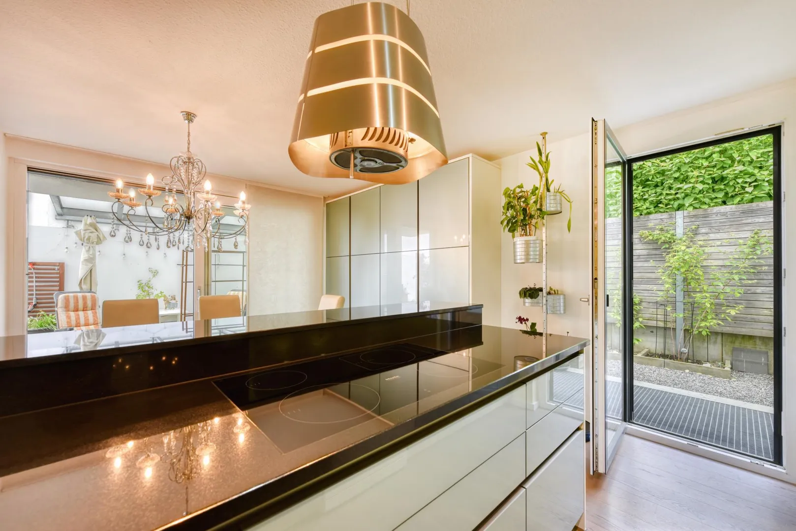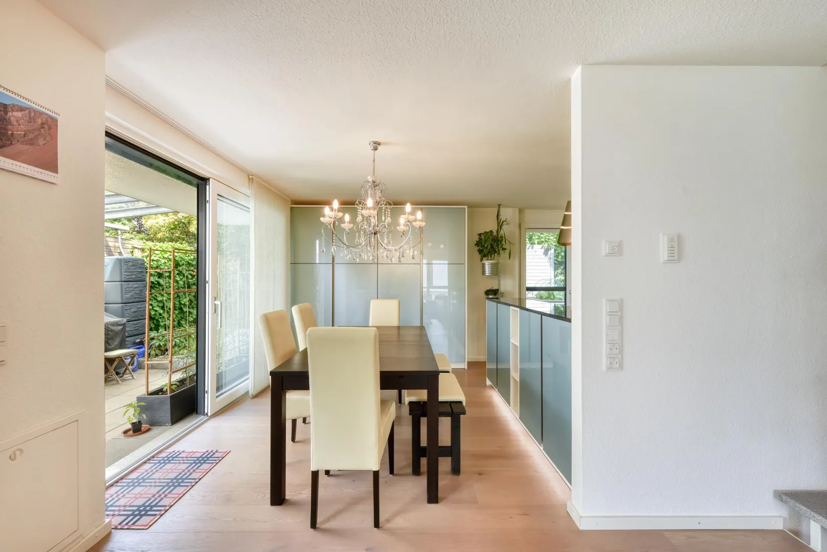 Im Terrassengeschoss befinden sich der offene Wohnbereich, welcher durch eine Milch-Glasschiebetür vom offenen Ess-/Küchenbereich getrennt werden kann.