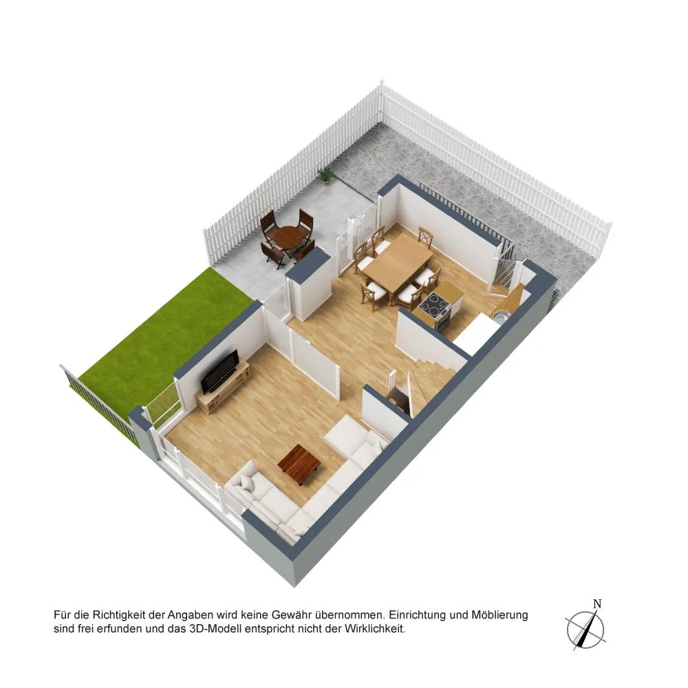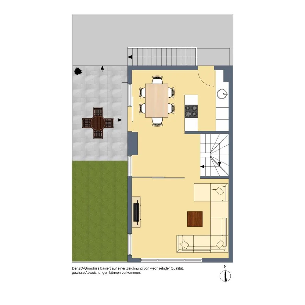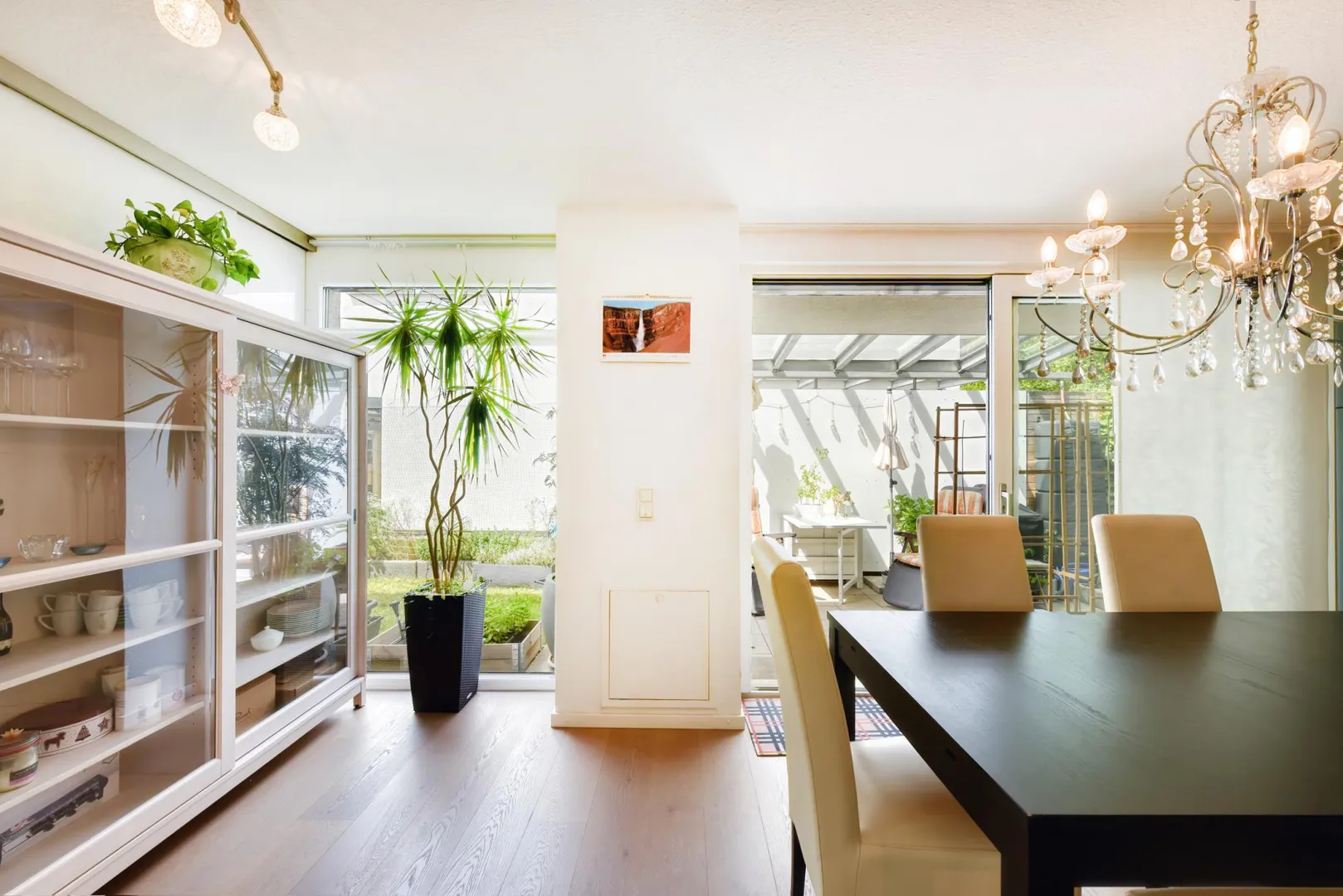 Über den Essbereich sind die überdachte Terrasse sowie eine Grünfläche, welche sich auf dem Garagendach befindet, begehbar. Über die Küche ist der rückwärtige Außenbereich begehbar.