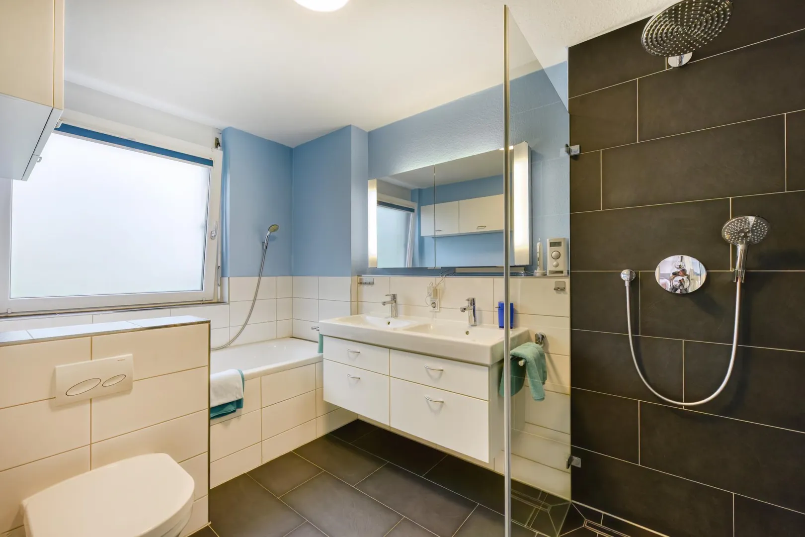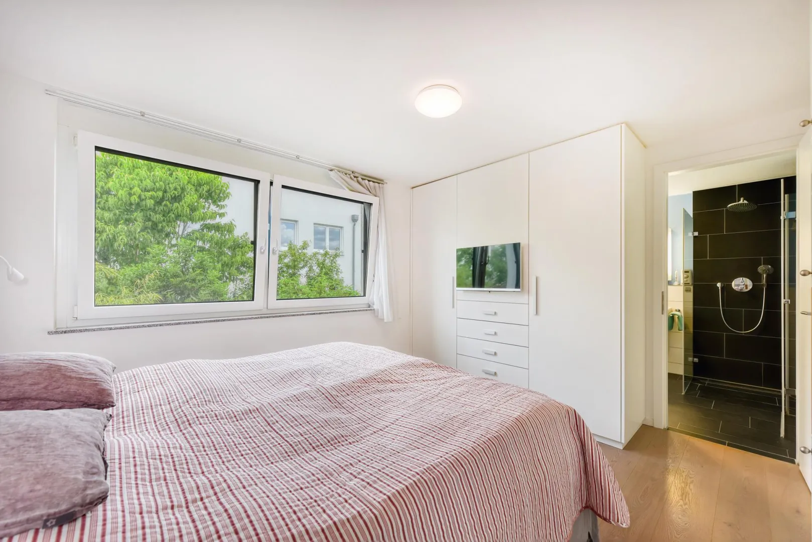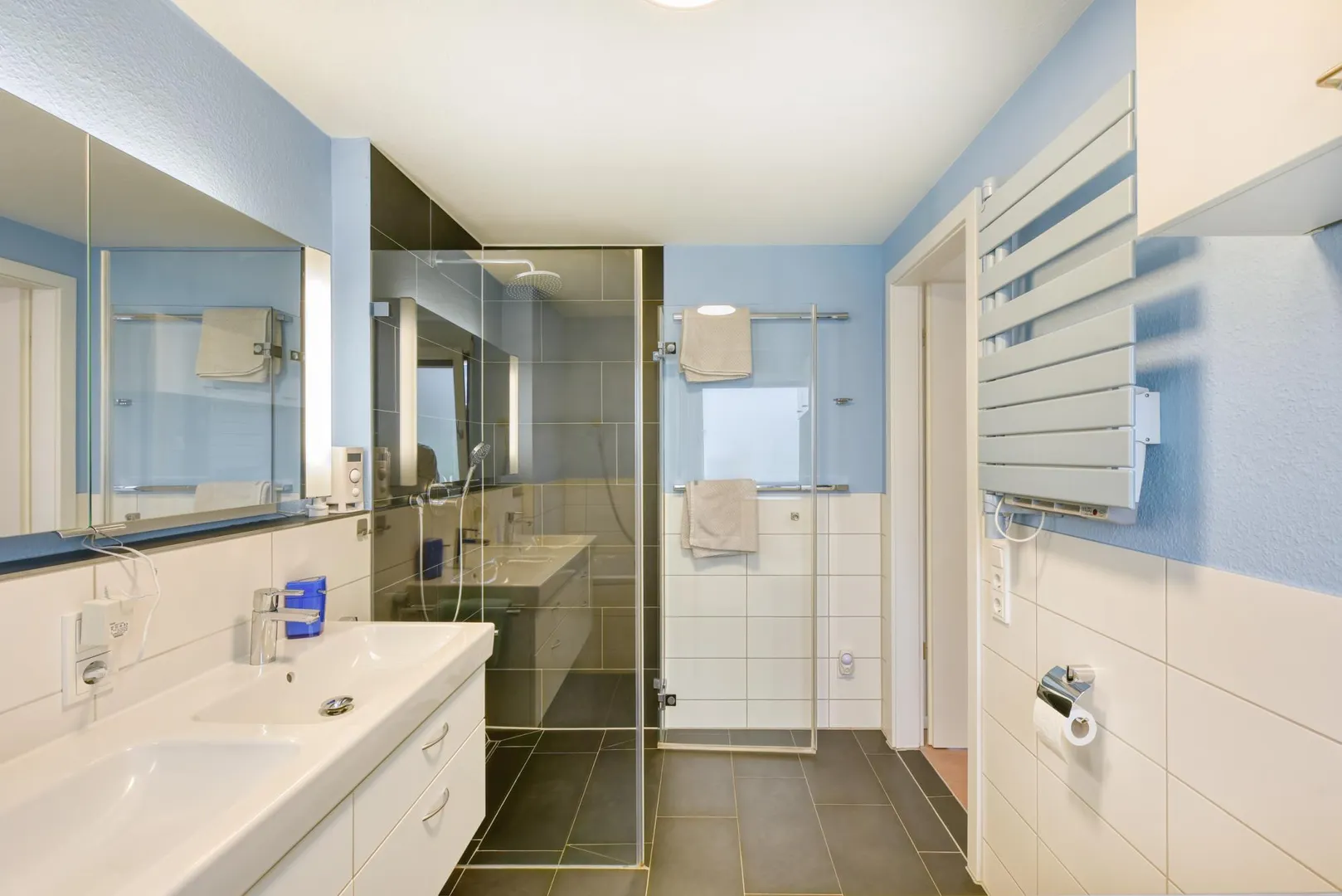 Im Dachgeschoss befinden sich zwei nach Süden ausgerichtete Zimmer mit bodentiefen Fenstern, ein Tageslicht-Badezimmer mit einer Dusche und einem WC sowie das auf der Nordhausseite gelegene Schlafzimmer mit einem Bad en suite. Das Tageslicht-Badezimmer verfügt über eine Badewanne, eine Dusche, ein WC sowie ein Doppel-Waschbecken.