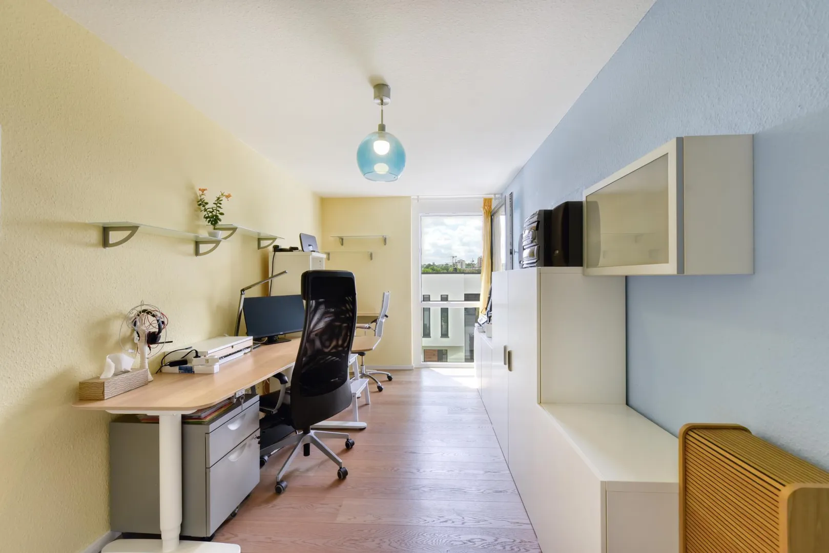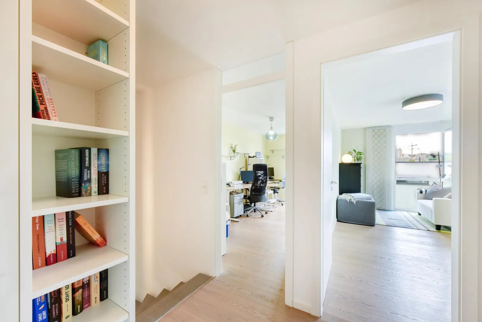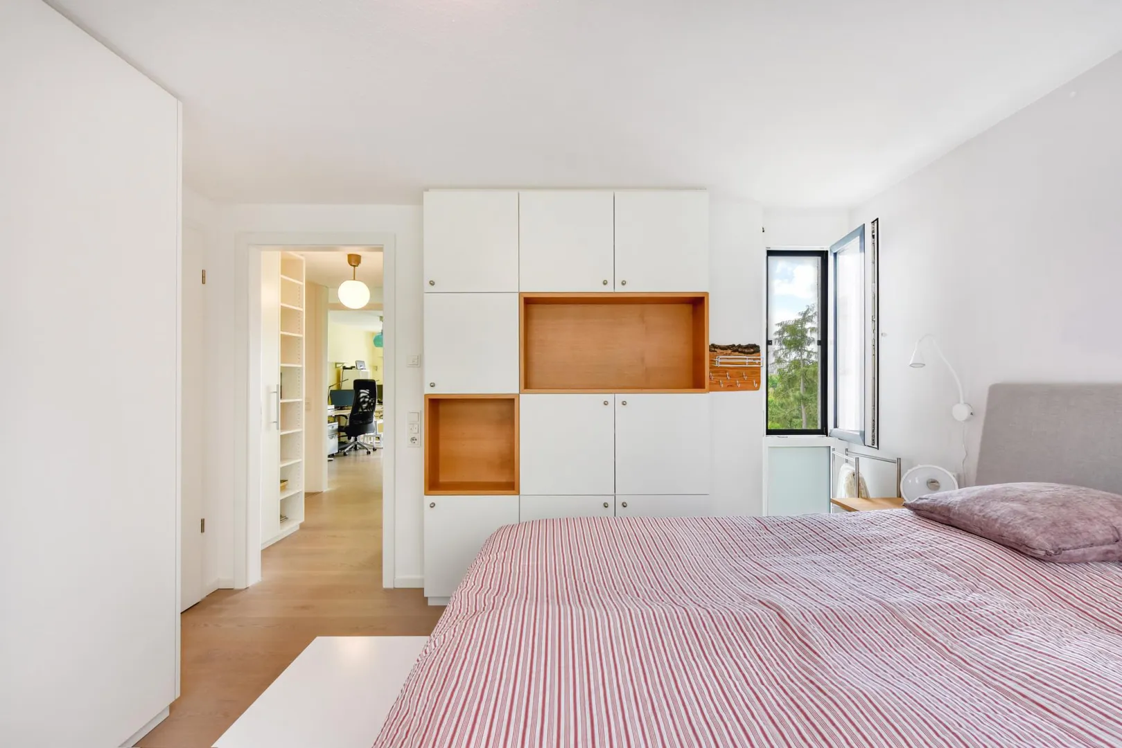 Die Fenster sind bodentief. Der Boden ist mit einem edlen, geölten sowie gebürsteten Massivholz-Eiche-Parkett ausgestattet.