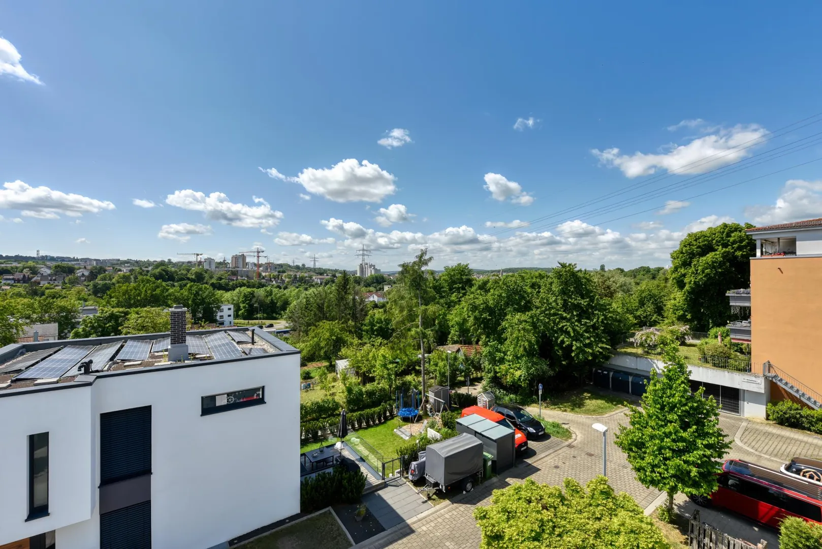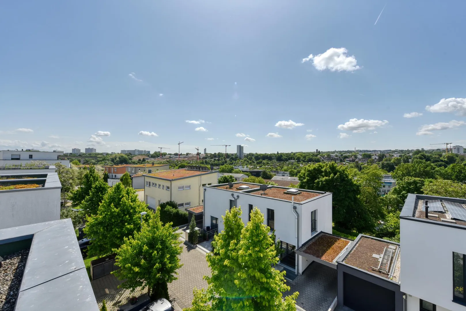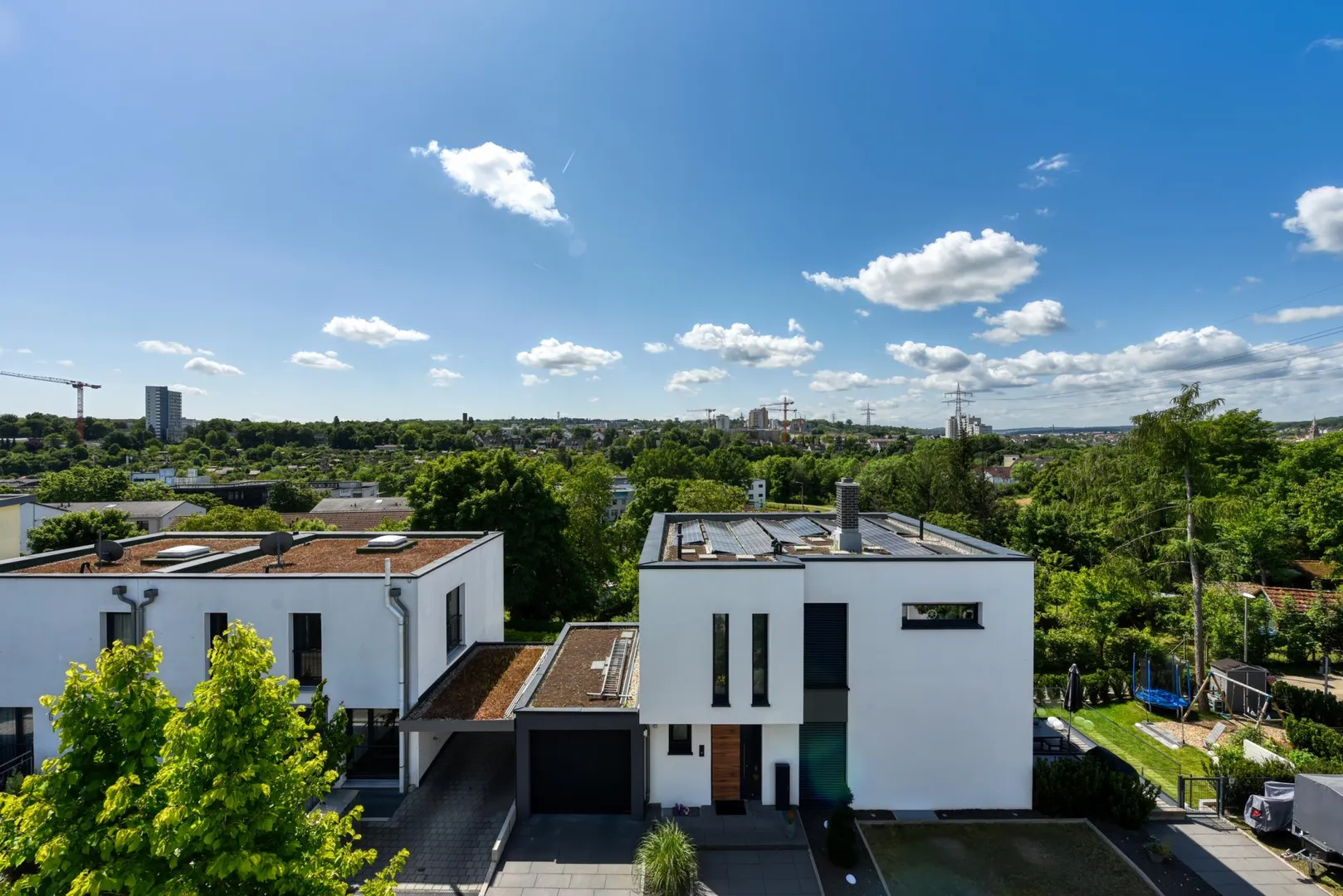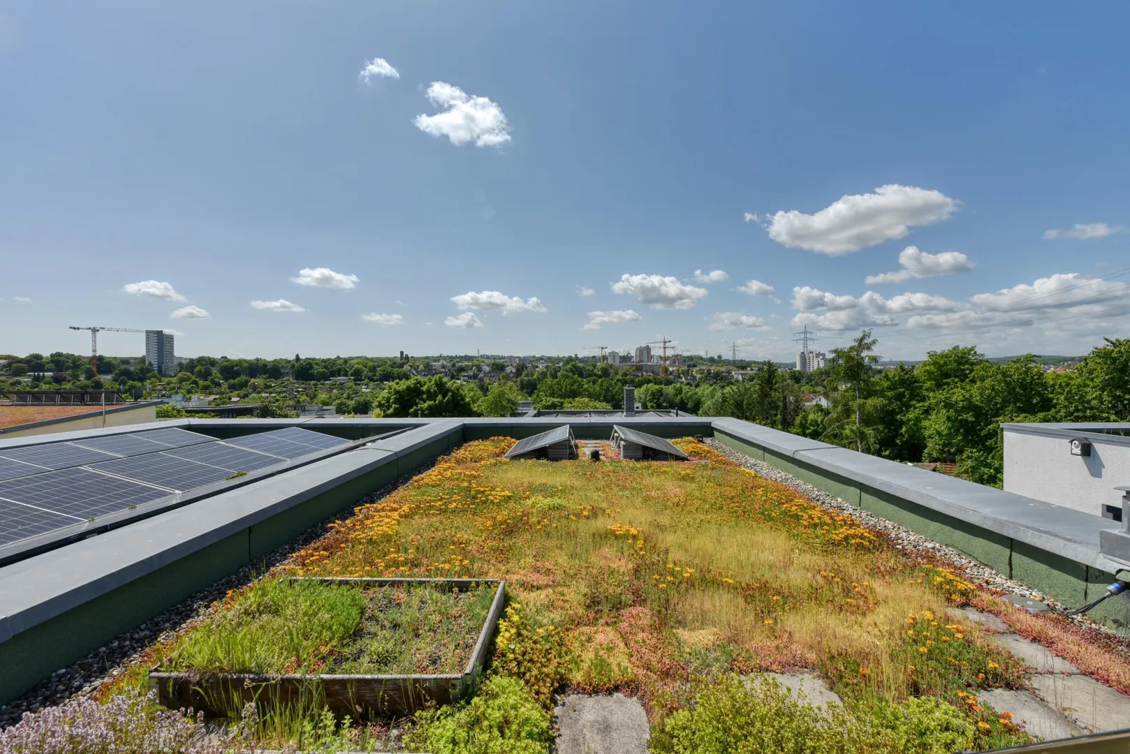 Das Dach ist über eine Stahl-Feuerleiter vom Terrassengeschoss begehbar und verfügt über einen Panorama-Fernblick nach Stuttgart-Rot.