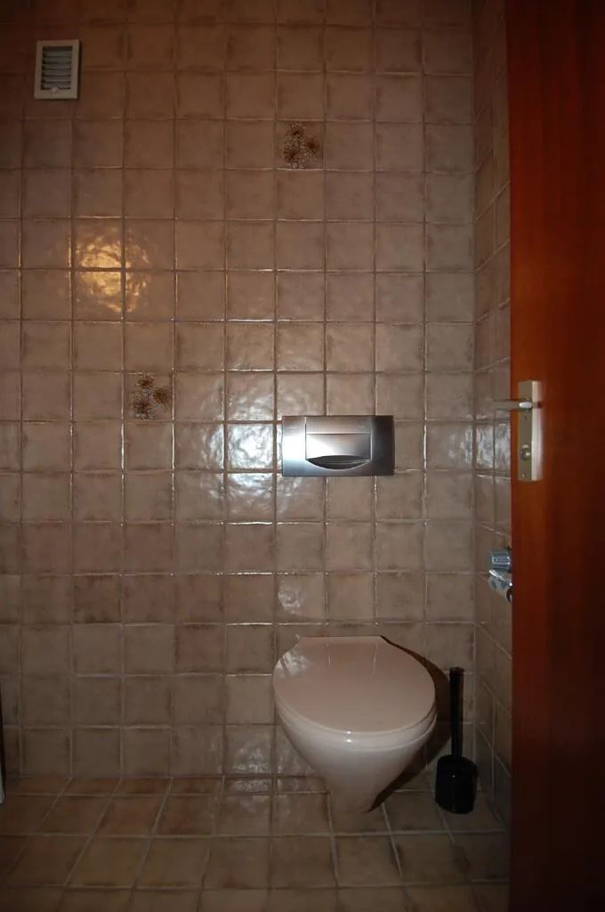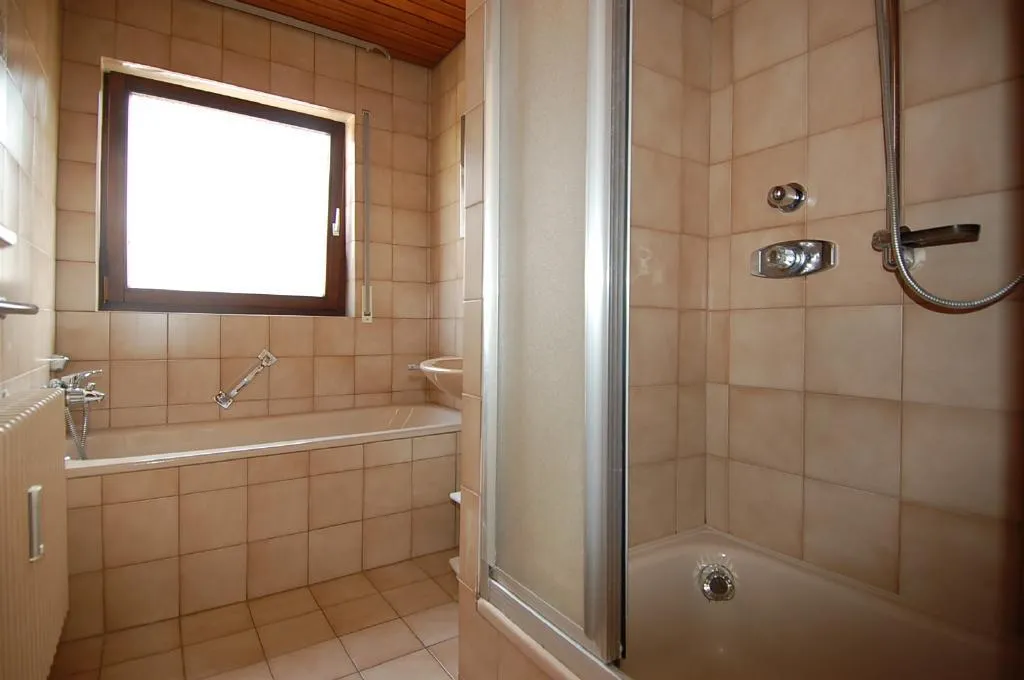 Das Badezimmer ist raumhoch gefliest und verfügt über ein Fenster. Es ist ausgestattet mit einer Badewanne, einer Dusche und einem Waschbecken. Das WC ist separat und ebenfalls gefliest.