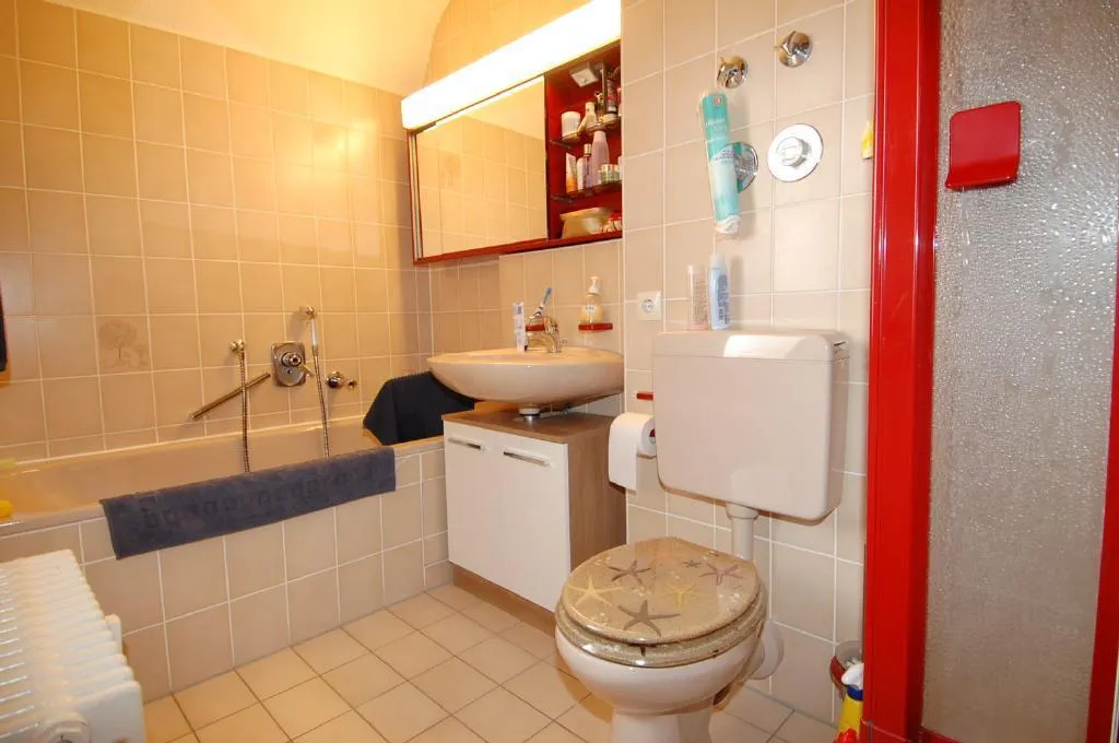 Das Badezimmer mit Fenster ist raumhoch gefliest und mit einer Badewanne, einer Dusche und einem WC ausgestattet. Es gibt ein weiteres separates geräumiges WC mit Waschmaschinenanschluß. Die Decke besteht aus Holzpanellen.