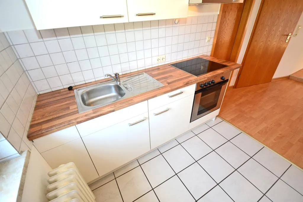 Die offene Küche ist mit einem Fliesenboden und einer Einbauküche ausgestattet. Die Einbauküche wurde ca. 2010 eingebaut und ist ausgestattet mit einem Kühlschrank, einem Gefrierschrank, einem Herd mit Backofen, einem Dunstabzug, Unter- und Oberschränken. Eine Spülmaschine sowie eine Stellplatzmöglichkeit für eine Spülmaschine sind nicht vorhanden. Die Einbauküche ist sehr gepflegt. Die Elektrogeräte sind alle funktionsfähig. Für die künftige Funktionsfähigkeit der E-Geräte übernimmt der Vermieter keine Haftung.