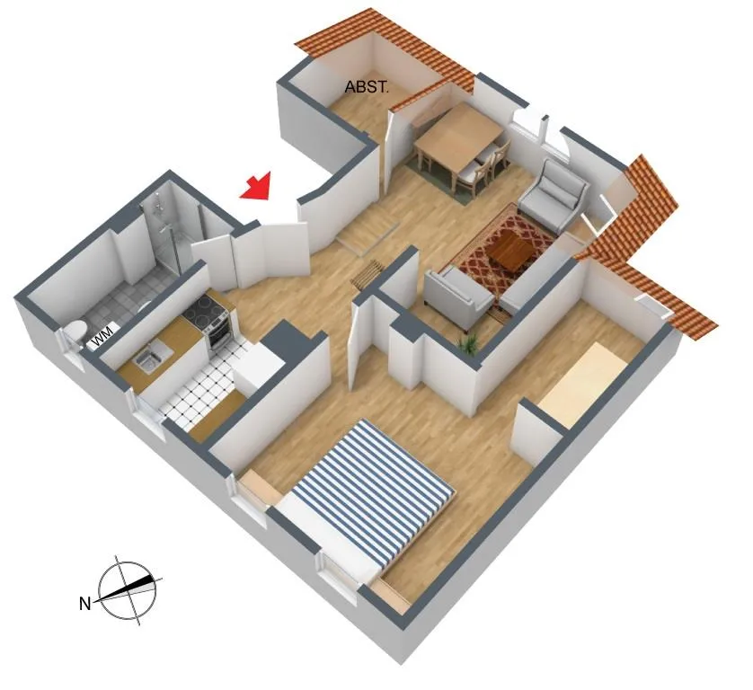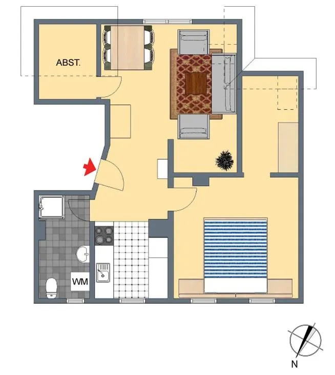 Der Grundriss ist offen gestaltet. Der Flur-, Wohn-, Ess- und Küchenbereich ist offen. Die Wohnung verfügt über keinen Balkon. Ein Abstellraum befindet sich in der Wohnung.