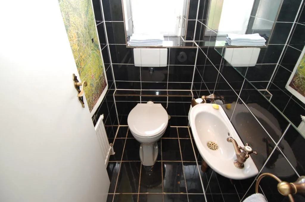 Das geflieste WC mit Fenster ist separat und mit einer Holzdecke mit Halogenlampen sowie einem Spiegel ausgestattet.