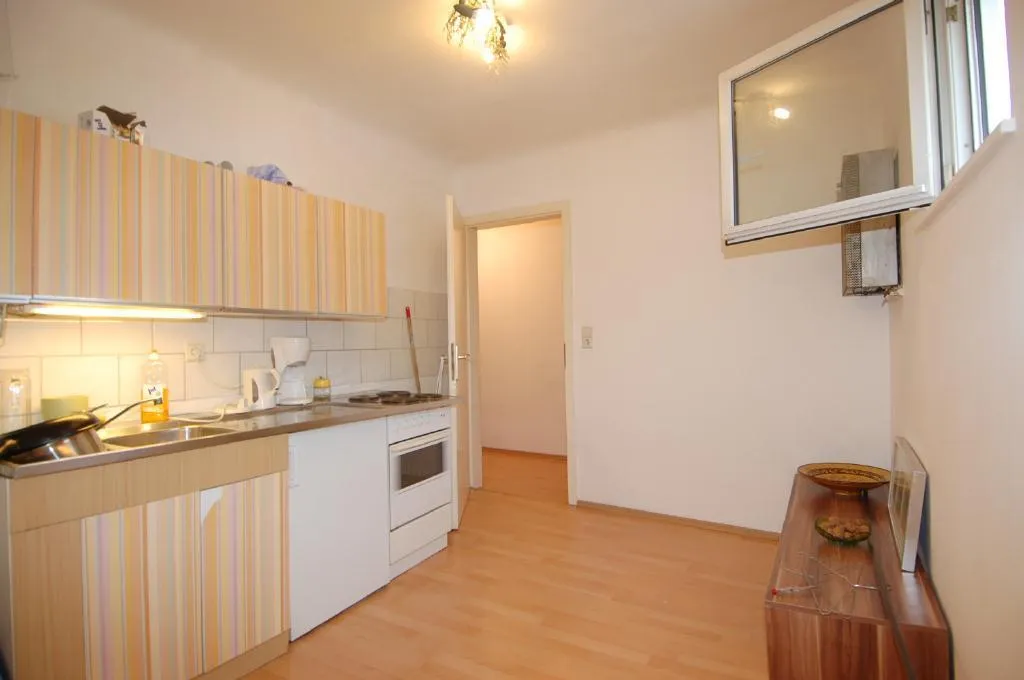 Die ältere und praktische Einbauküche beinhaltet eine Spüle, einen Herd/Ofen mit 4 Kochplatten und Schränke.