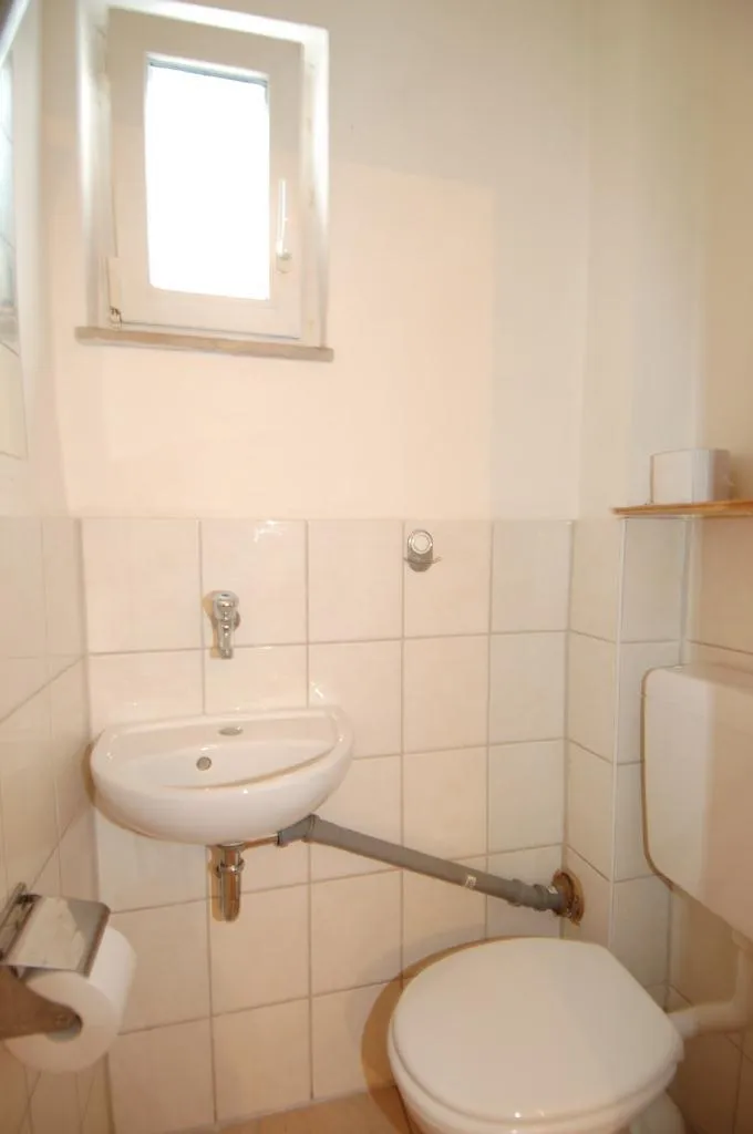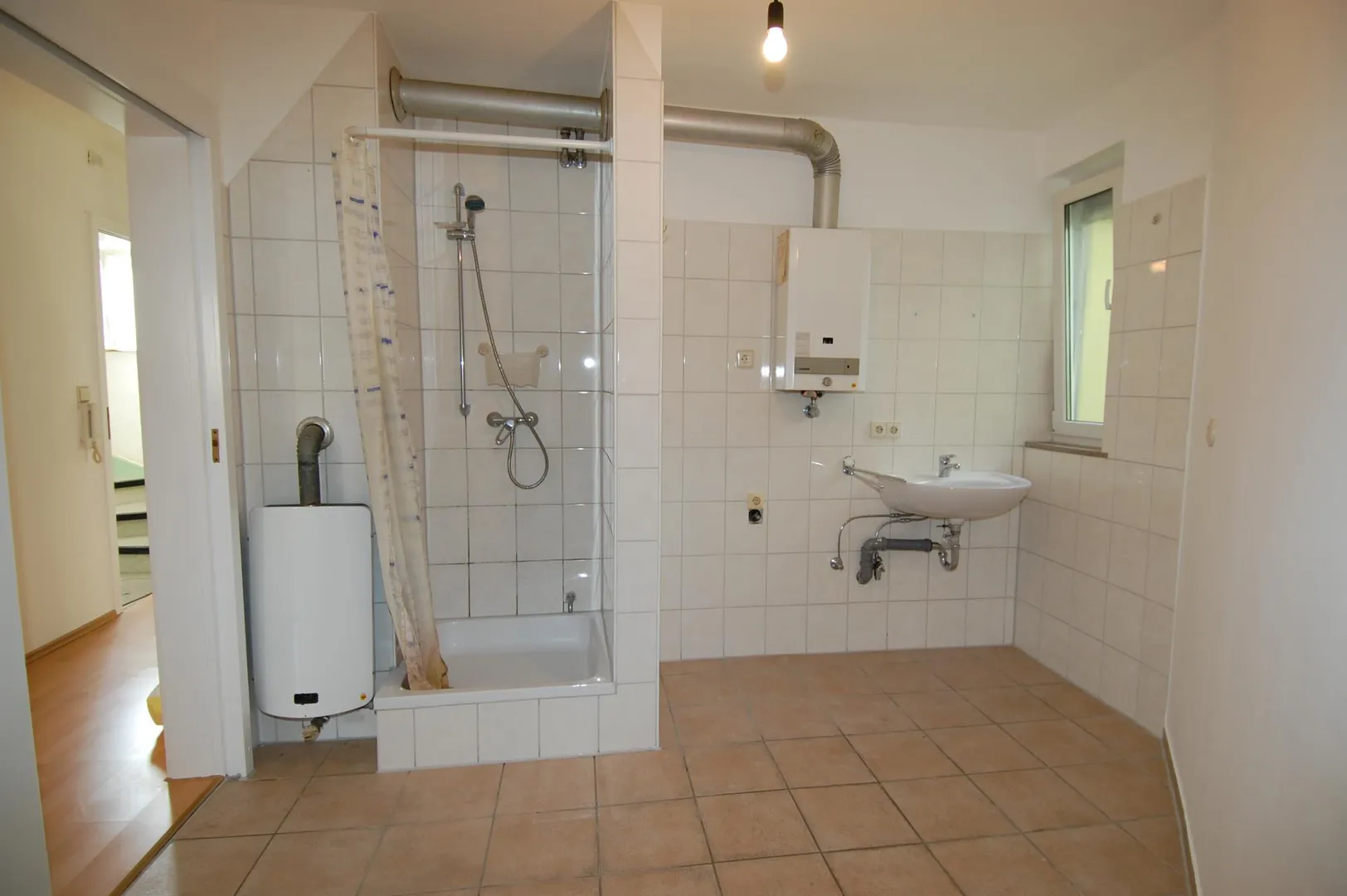Das Bad ist teilweise gefliest und verfügt über einen Fliesenboden, eine Dusche, ein Waschbecken, ein Fenster und einen Waschmaschinenanschluss. Die Warmwasseraufbereitung erfolgt über eine Gas-Therme.