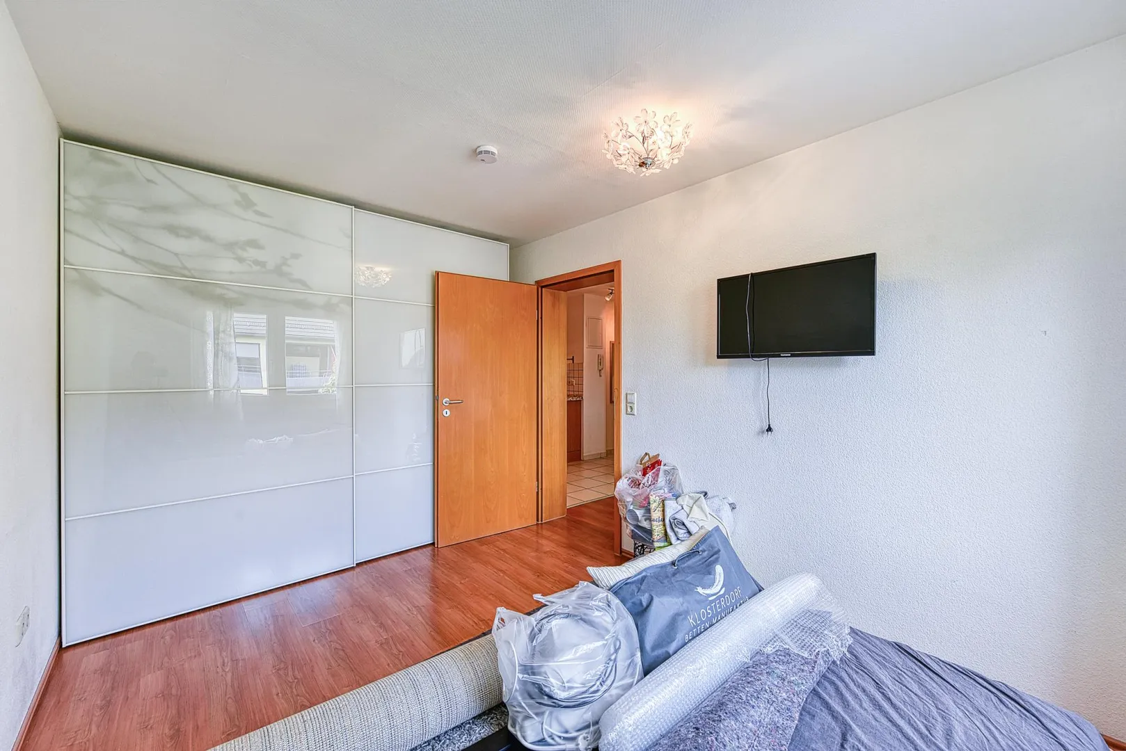 Die Wände sind mit Raufasertapeten tapeziert und wurden 2022 weiß gestrichen. Die Raumhöhen betragen ca. 2,38 Meter.