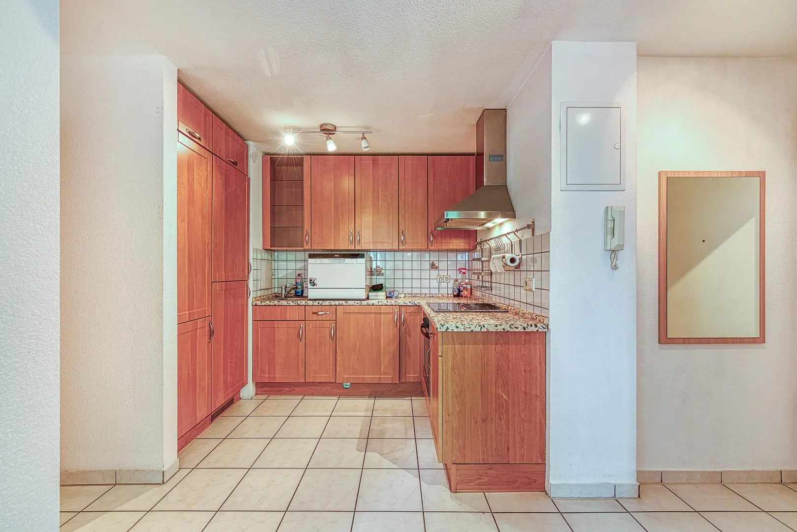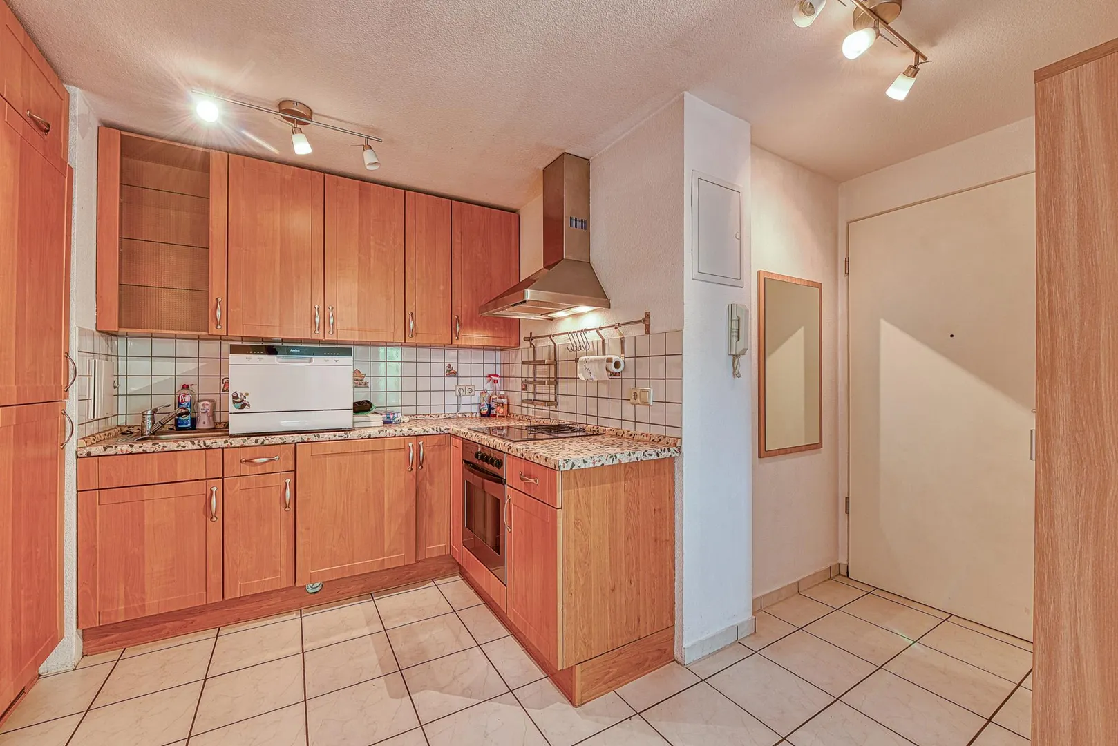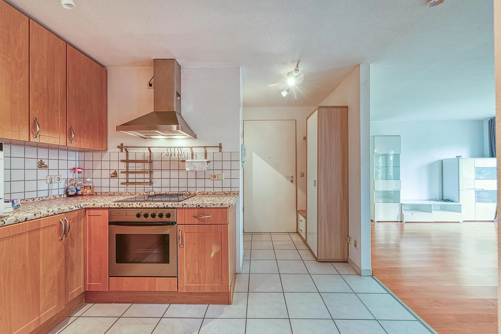 Die Böden im Flur-/Küchenbereich sind gefliest. In den Zimmern ist Laminat verlegt.