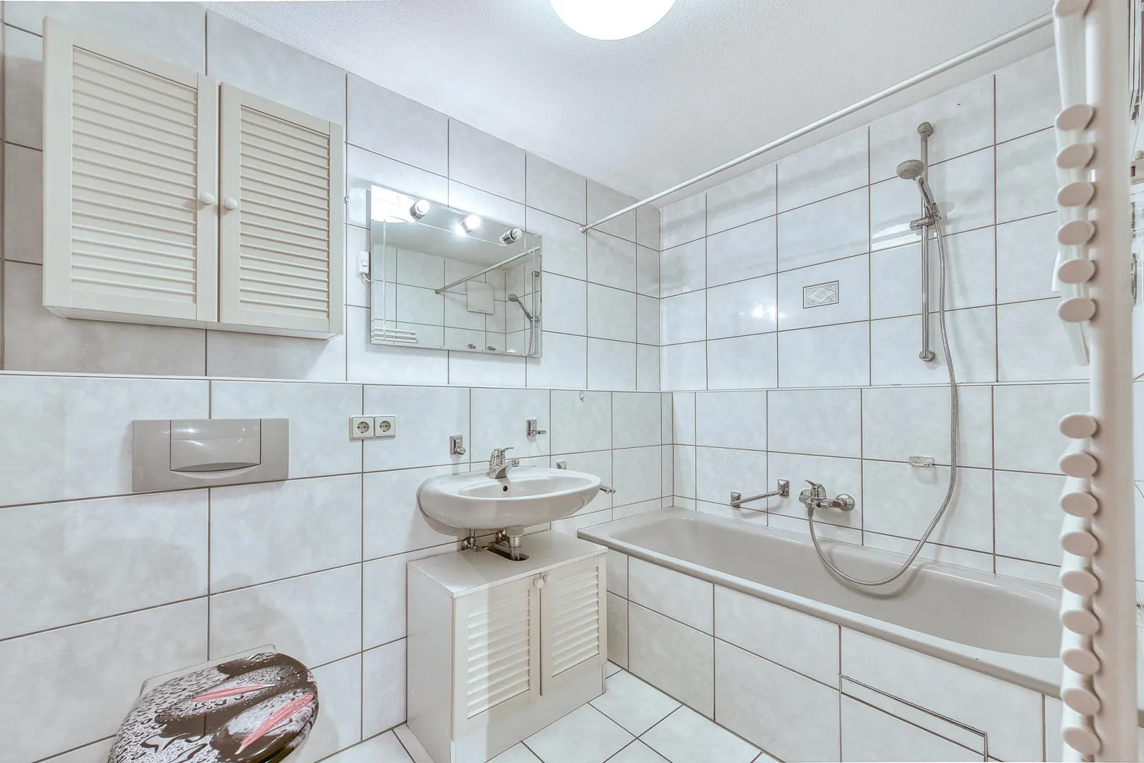 Das raumhoch geflieste Badezimmer mit Fliesenboden ist ausgestattet mit einer Badewanne, einem WC, einem Handtuch-Heizkörper, einem Waschtisch-Unterschrank, einem Hängeschrank sowie einem Spiegel mit Belichtung.