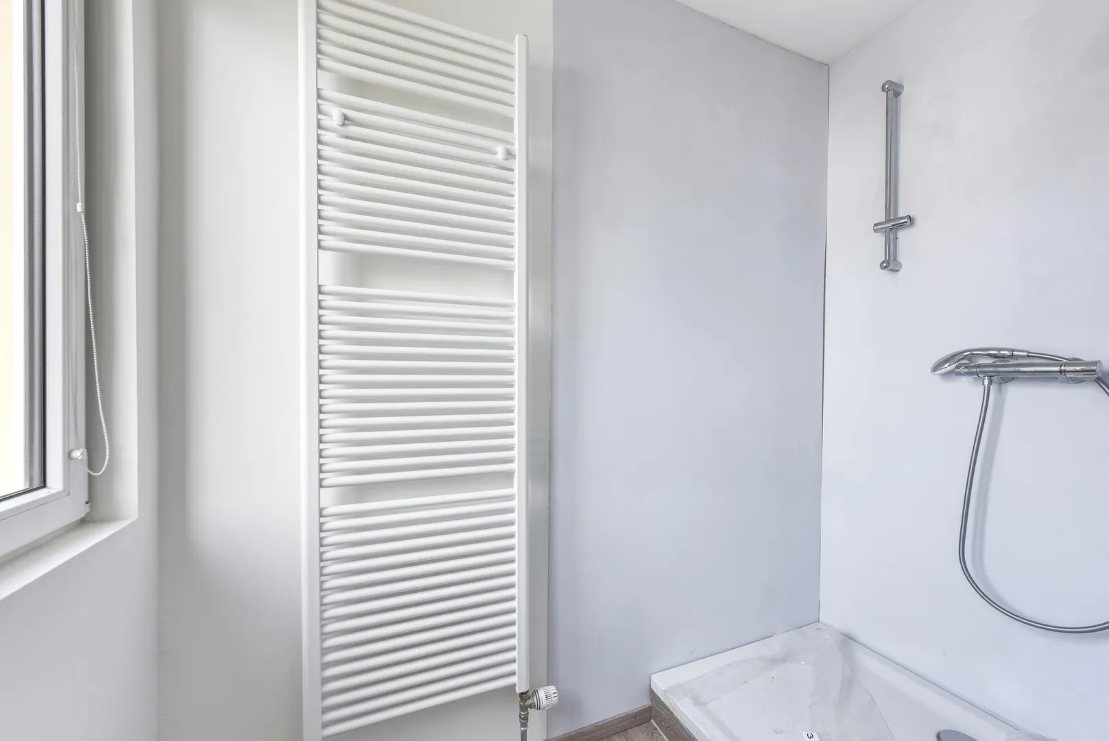 Das Tageslicht-Badezimmer ist ausgestattet mit einer Dusche, einem Handtuch-Heizkörper sowie einem Waschmaschinen-Anschluss.