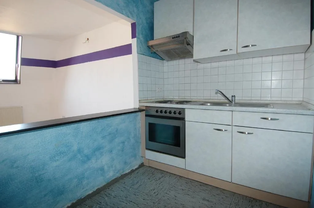 Die Einbauküche ist ausgestattet mit einen Herd mit Kochfeld, einen Backofen, einen Dunstabzug, einer Spüle und Unter- und Oberschränke.