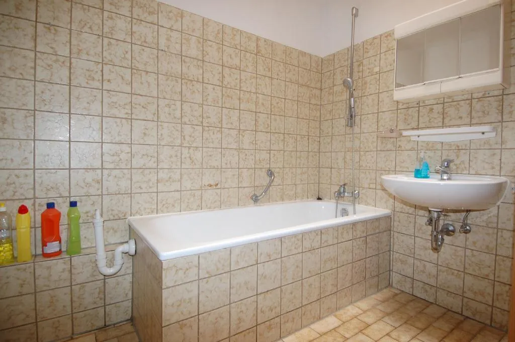 Das Badezimmer ist halbhoch gefliest und mit einer Wanne, einen WC und einen Waschmaschinenanschluss ausgestattet.