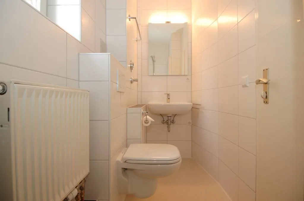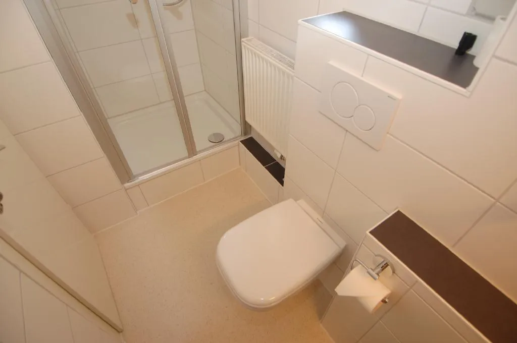 Das Badezimmer wurde aktuell komplett modernisiert. Das raumhoch geflieste Bad mit Fenster ist ausgestattet mit einer Dusche und einem WC. Auf dem Boden ist PVC-Belag verlegt.