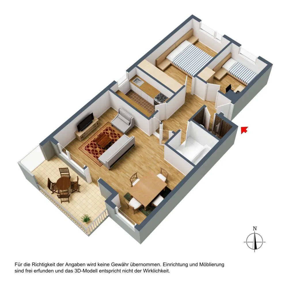 Das Wohnzimmer mit Balkon sind nach Süden ausgerichtet, das Schlafzimmer sowie das Kinderzimmer nach Norden, die Küche nach Westen, die beiden Bäder sind innenliegend.