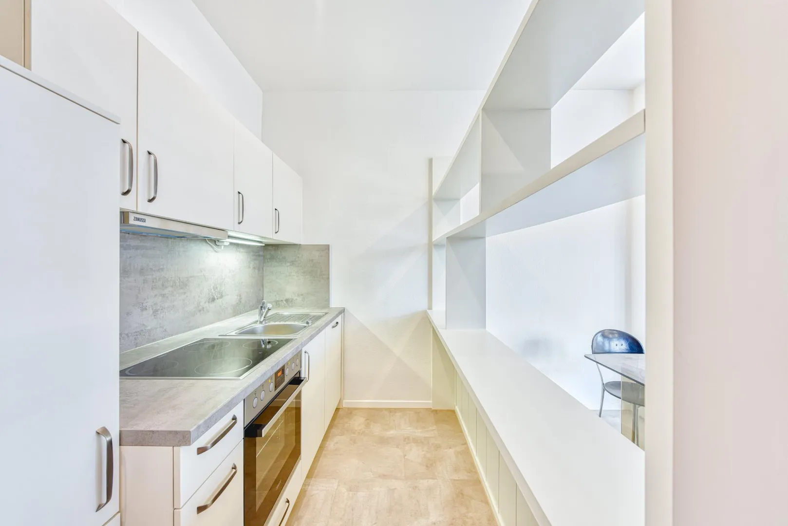 Die offene Küche ist mit einer neuen Einbauküche ausgestattet. Die Einbauküche verfügt über einen Kühlschrank mit Gefrierfach, einen Herd mit Backofen, einen Dunstabzug, eine Waschmaschine, einen Durchlauferhitzer fürs Warmwasser sowie Unter- und Oberschränke. Eine Spülmaschine ist nicht vorhanden. Die geschätzten Stromkosten fürs Warmwasser iHv. 10 EUR monatlich sind bereits in der Nebekosten-Angabe enthalten und sind direkt vom Mieter an den Versorger zu bezahlen.
