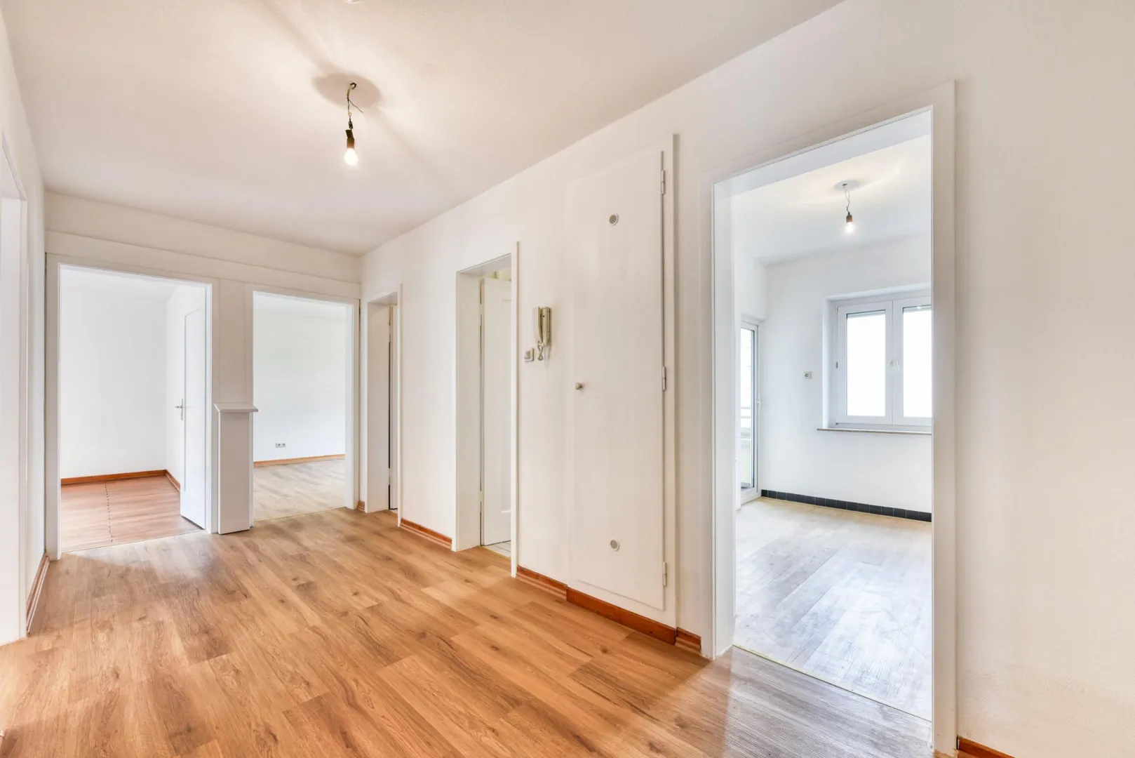 Die Wände sind überwiegend mit Raufasertapeten tapeziert und frisch, weiß gestrichen.
