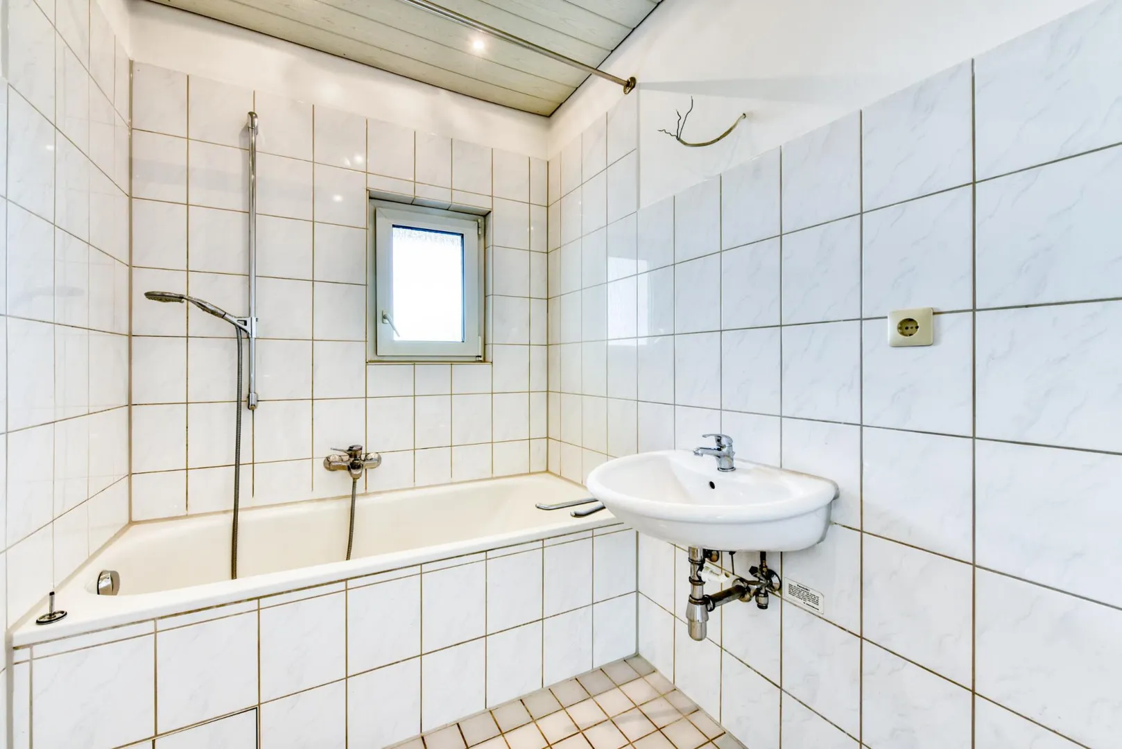Das 2/3-hoch geflieste Badezimmer mit Fenster ist ausgestattet mit einem Fliesenboden, einer Badewanne sowie einem Waschmaschinen-Anschluss.