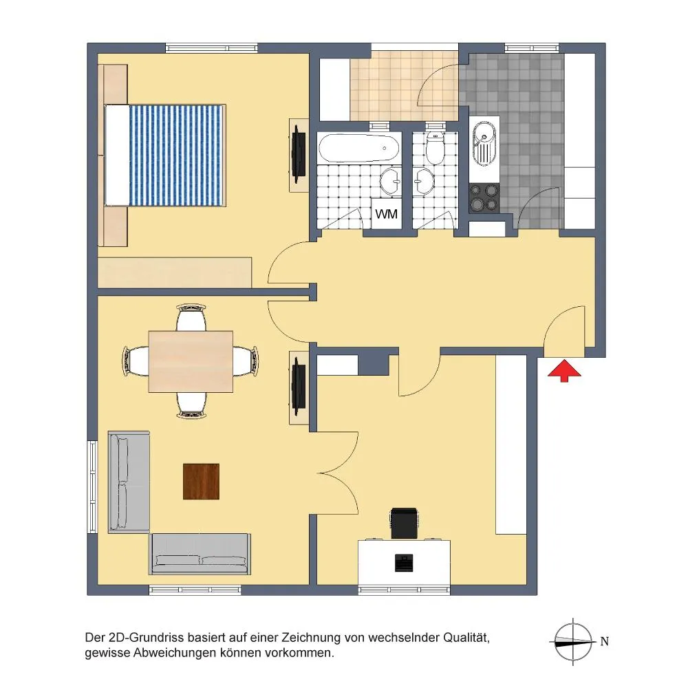Der Grundriss ist gut: alle Räume sind direkt vom Flur begehbar, die Veranda ist über die Küche begehbar, das Badezimmer verfügt über ein Fenster, das separate WC verfügt ebenfalls über ein Fenster, zwischen dem Wohnzimmer sowie dem Arbeitszimmer gibt es zusätzlich eine zweiflüglige Glastür.