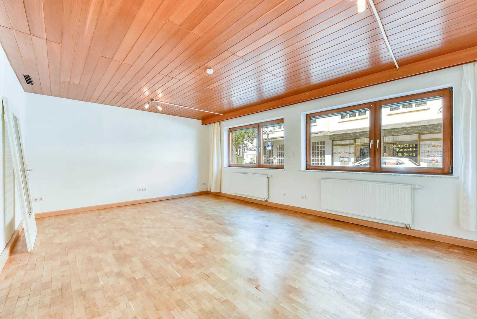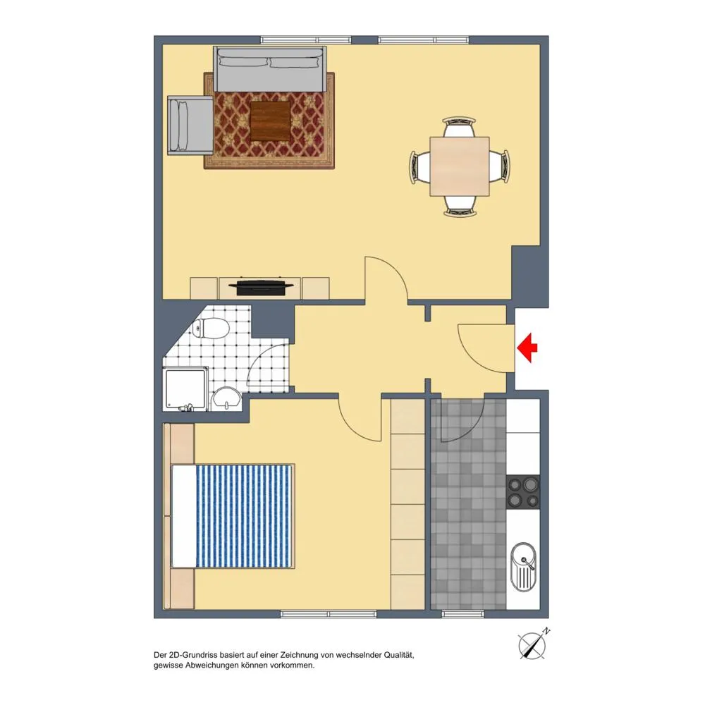 Das Wohnzimmer ist zur Straße, nach Nord-Westen ausgerichtet. Das Schlafzimmer sowie die Küche sind zur Terrasse nach Süd-Osten ausgerichtet.