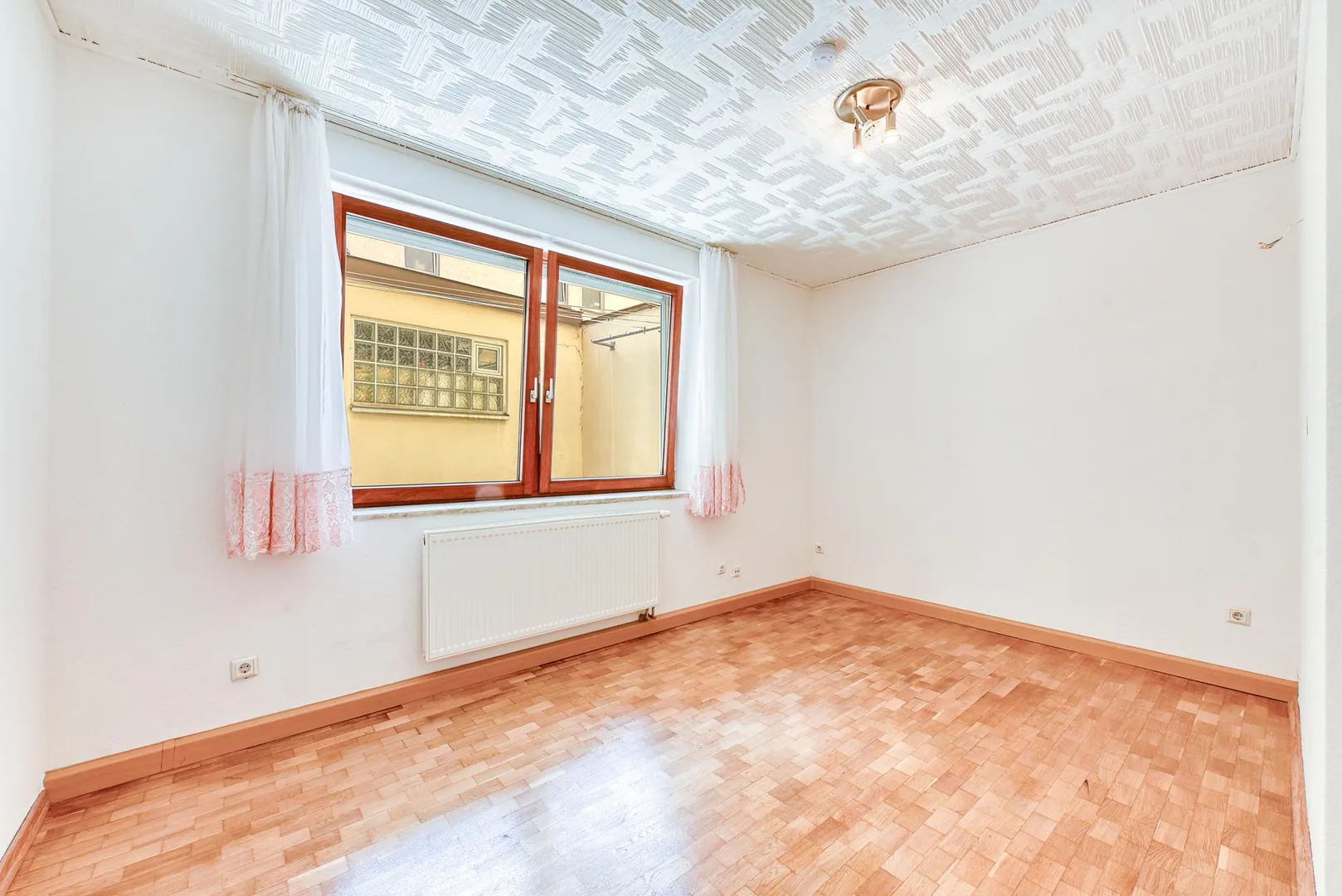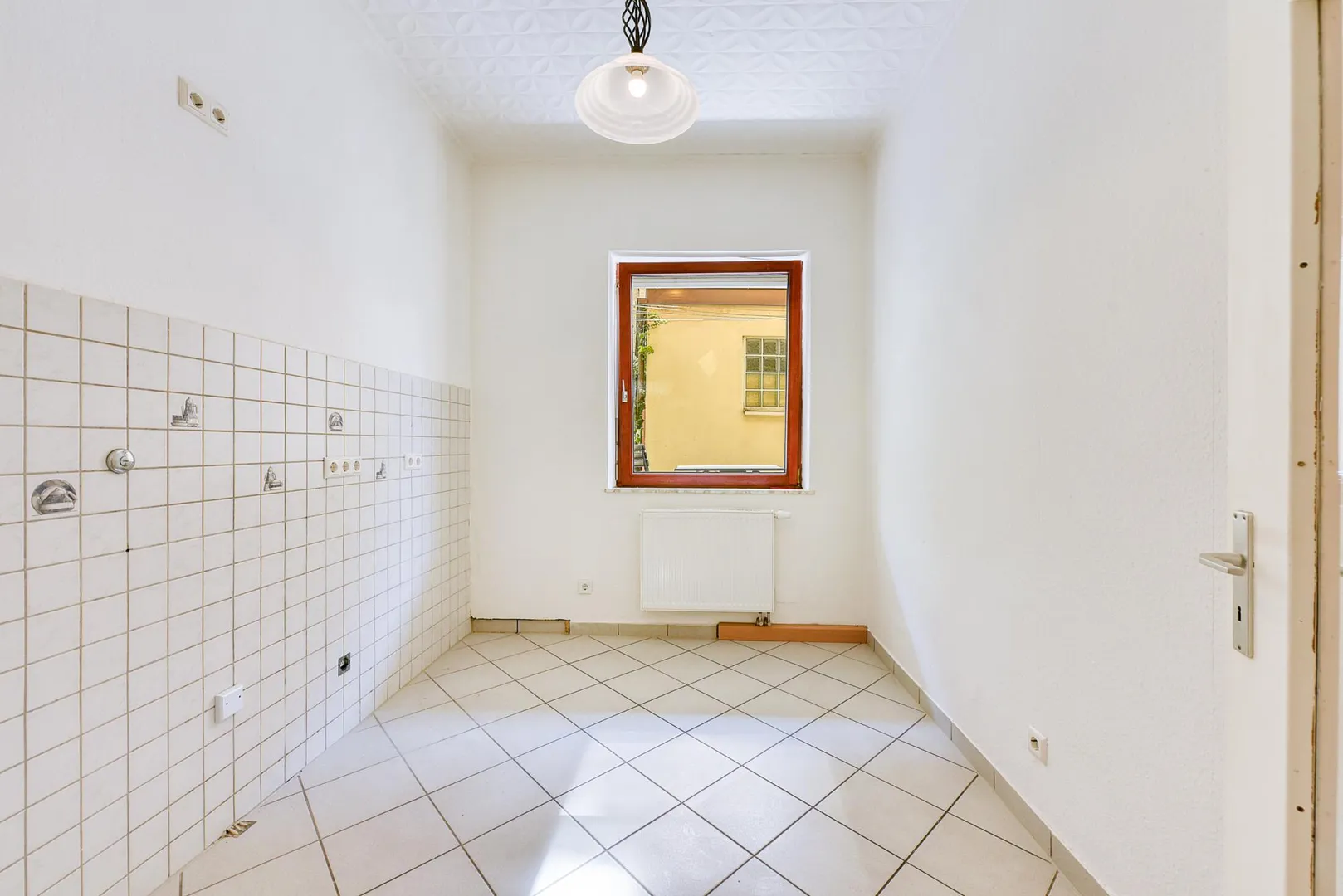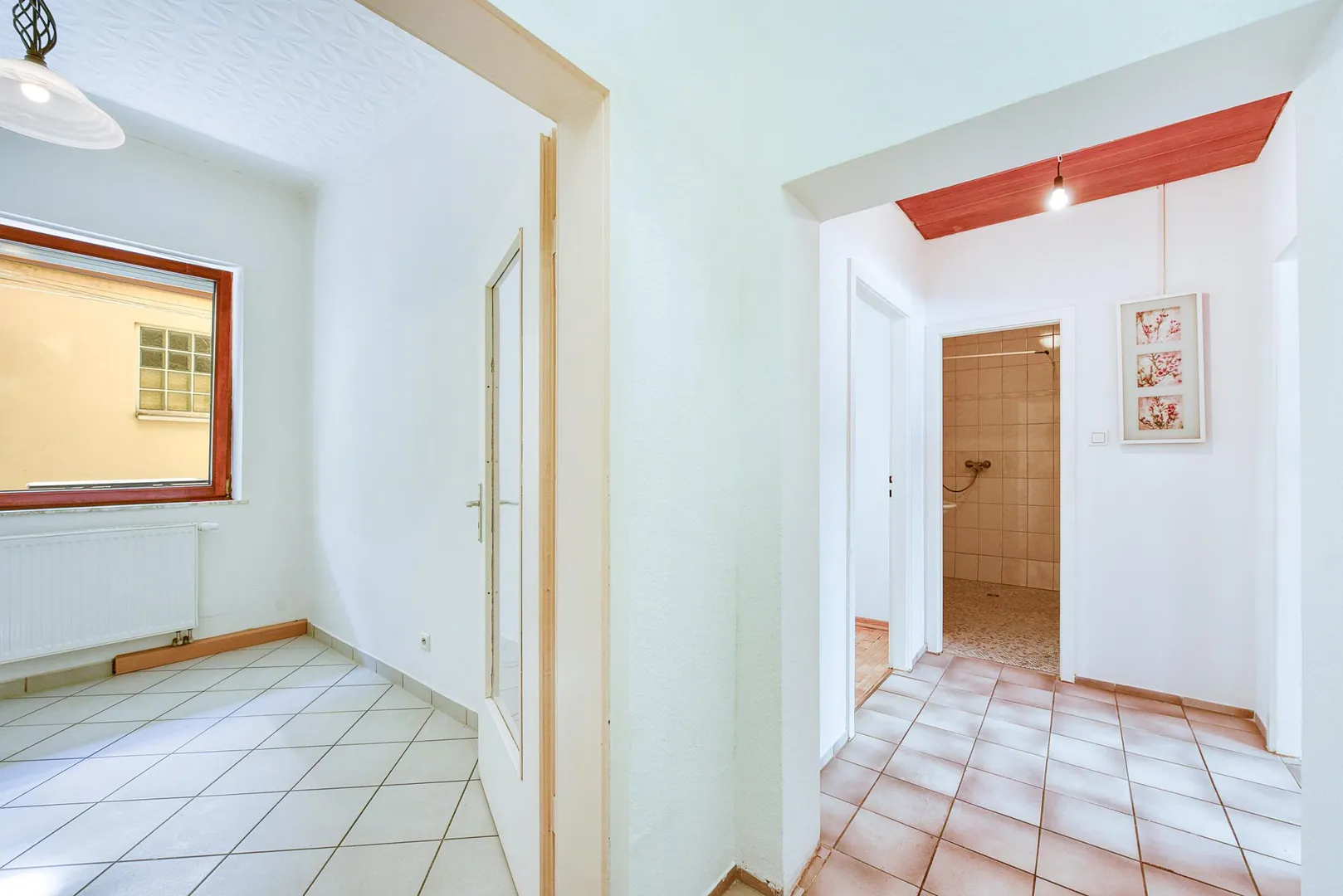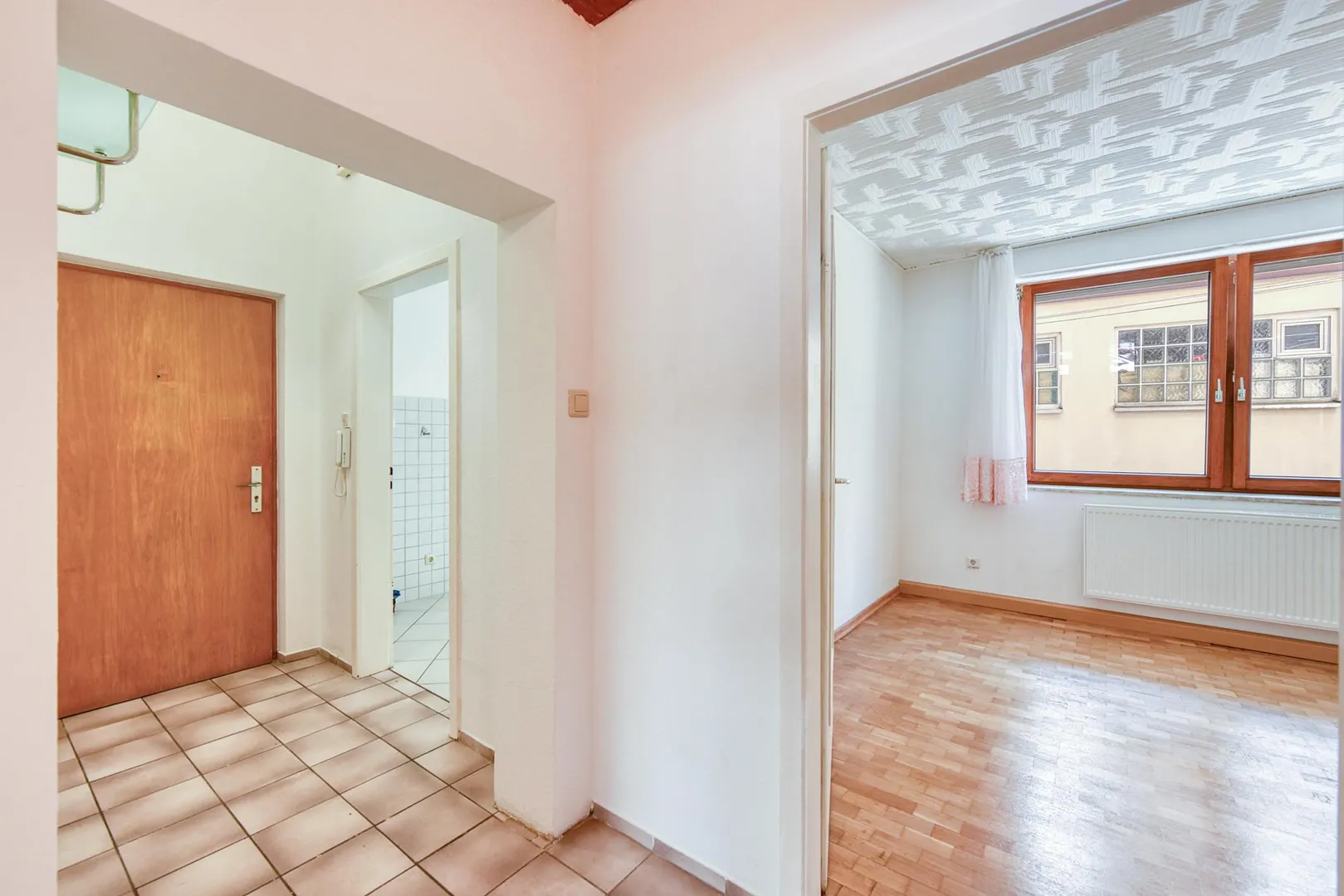 Die Wände sind überwiegend mit Raufasertapeten tapeziert und frisch, weiß gestrichen.