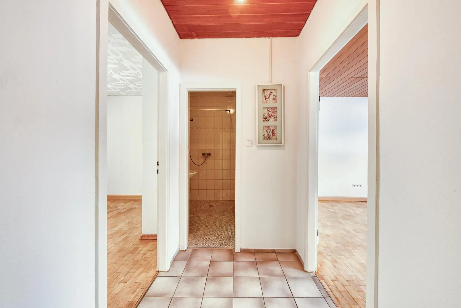 In den Zimmern ist Parkett verlegt. Die Böden im Flur, im Badezimmer sowie in der Küche sind gefliest.