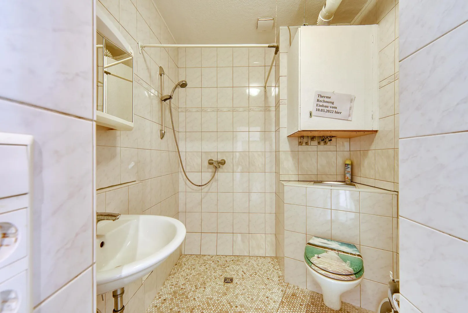 Das raumhoch gefliest Badezimmer ist ausgestattet mit einer bodentiefen Dusche, einem WC, einem Handtuch-Heizkörper sowie einer Gas-Therme.