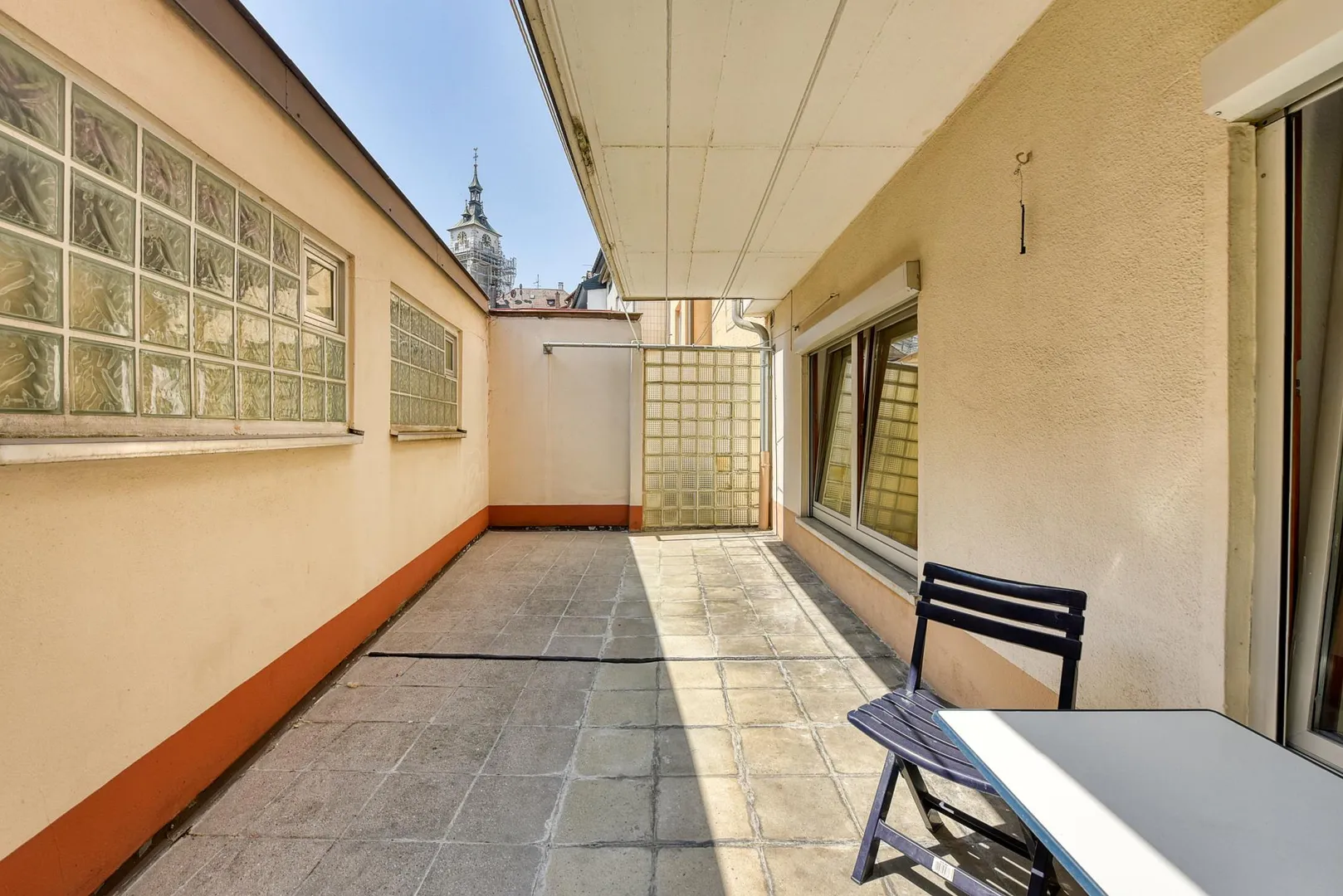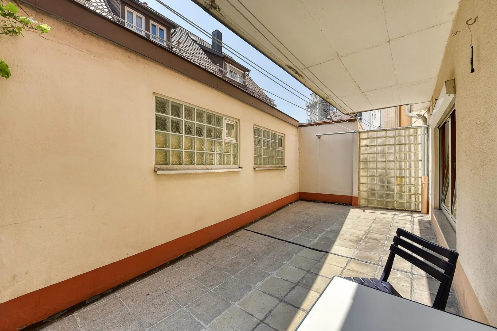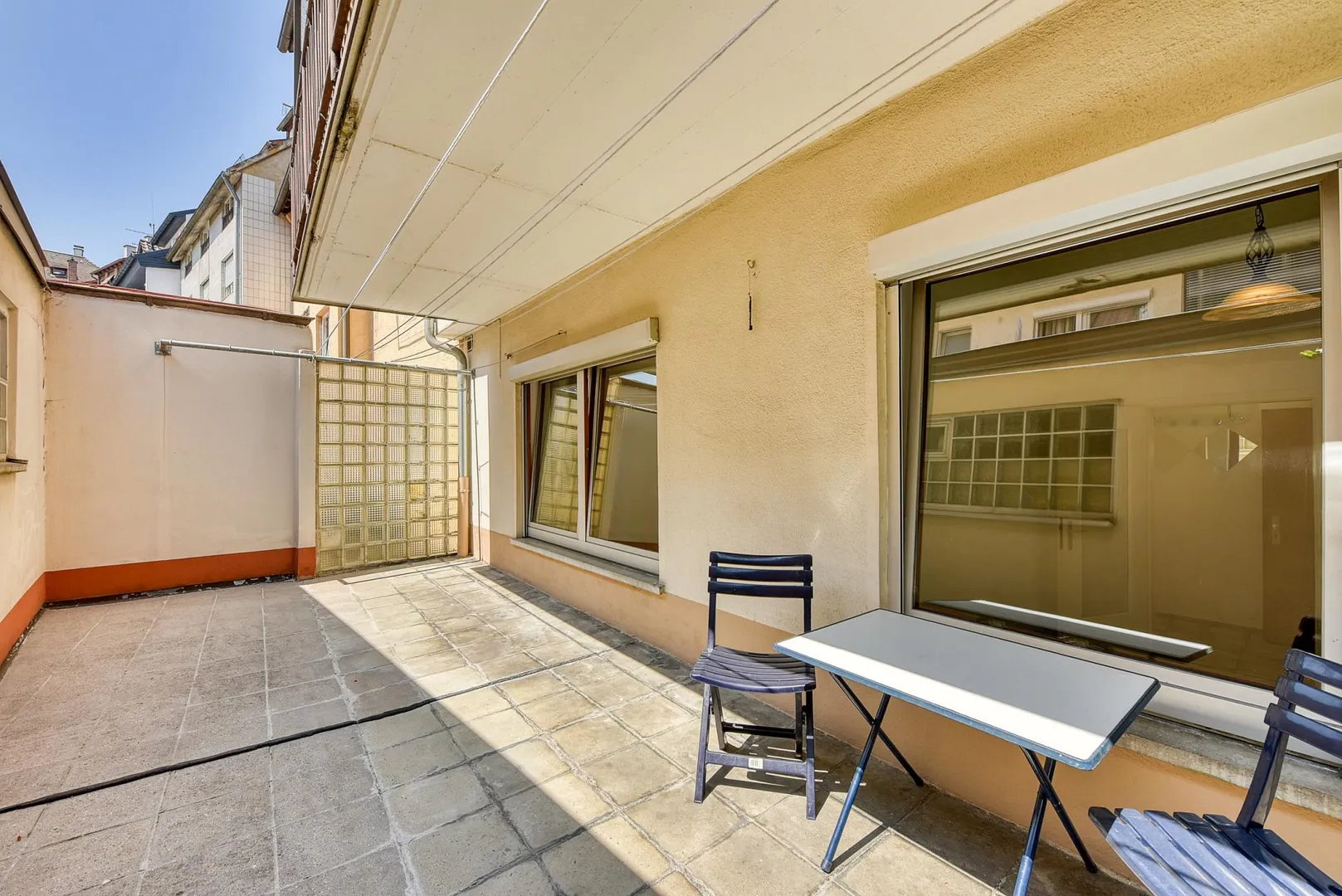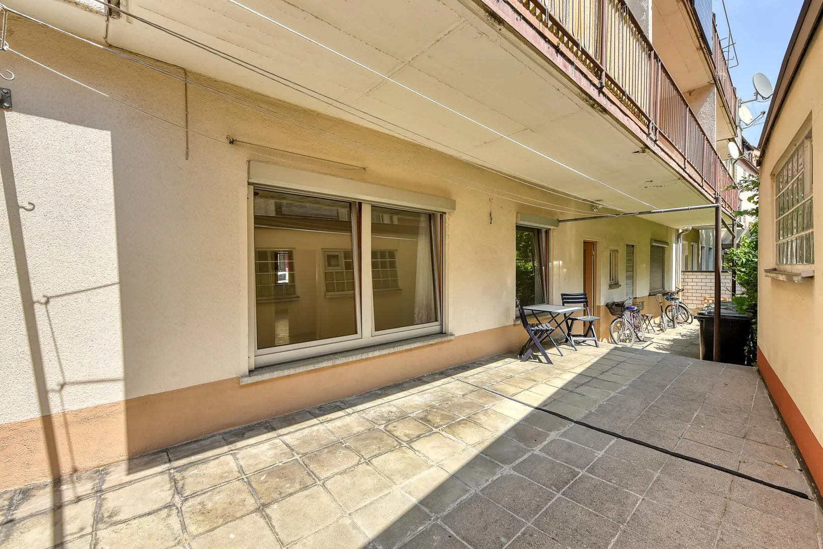 Diese zentral gelegene und renovierte 2-Zimmer-Wohnung mit gemeinschaftlicher Terrasse befindet sich im Erdgeschoss.