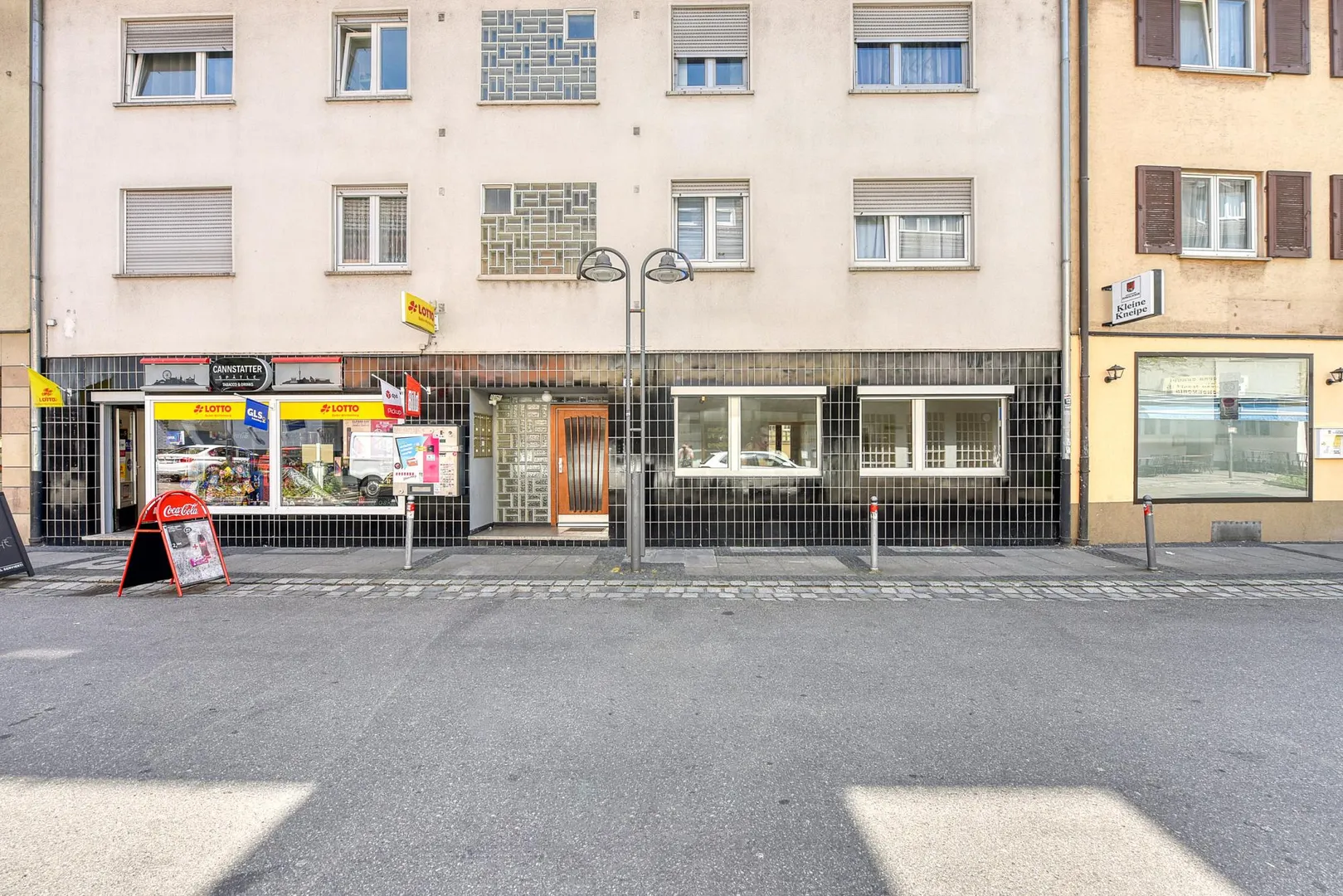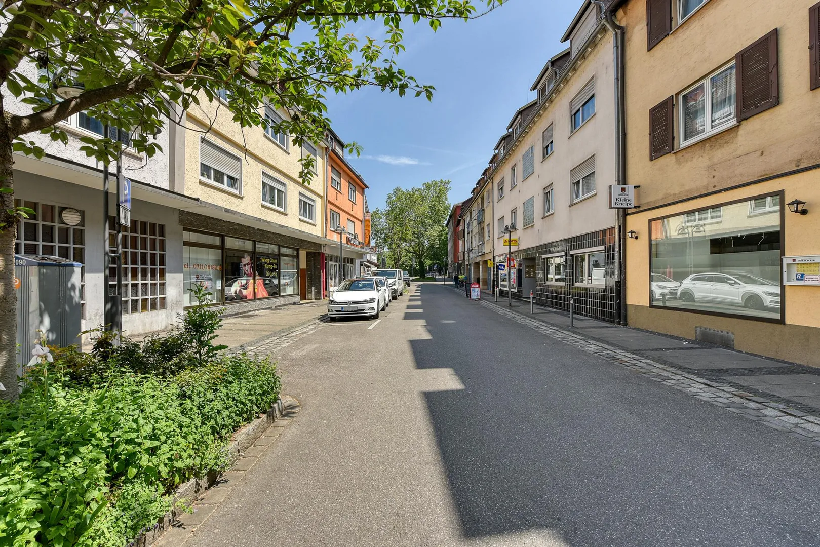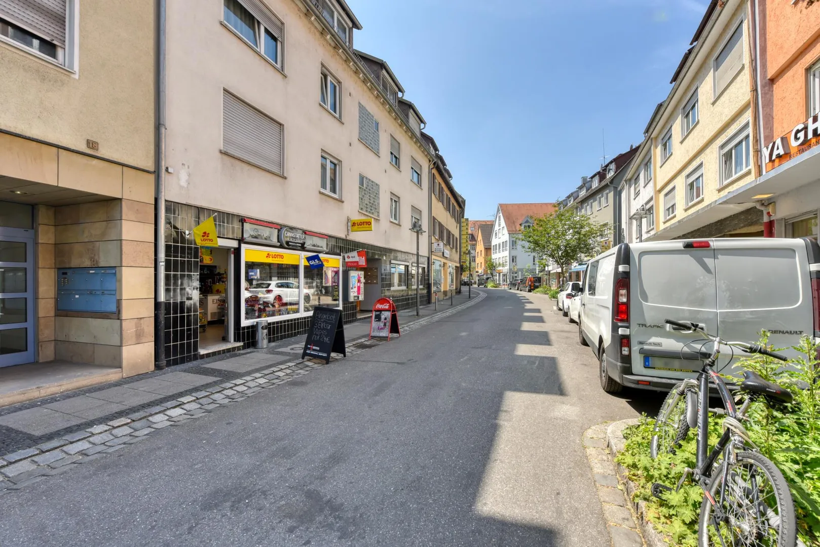 Diese zentral gelegene und renovierte 2-Zimmer-Wohnung mit gemeinschaftlicher Terrasse befindet sich im Erdgeschoss rechts eines Wohn- und Geschäfts-Reihen-Mittel-Hauses mit einem Kiosk im Erdgeschoss links sowie 10 Wohneinheiten.