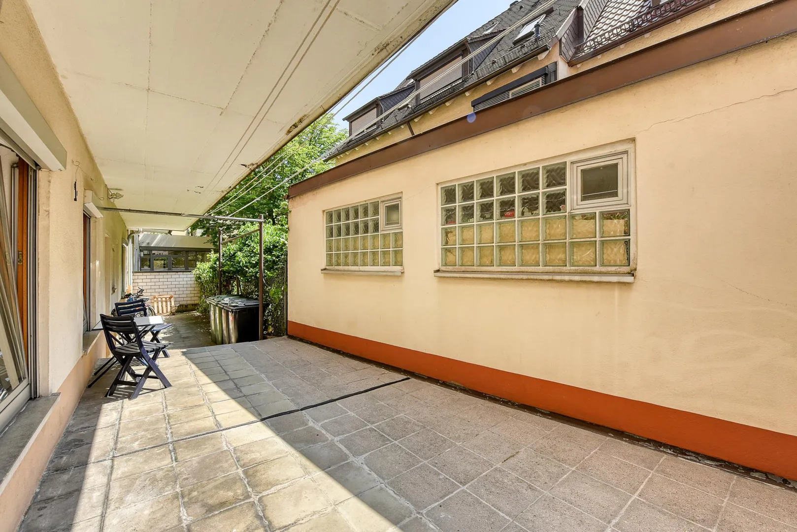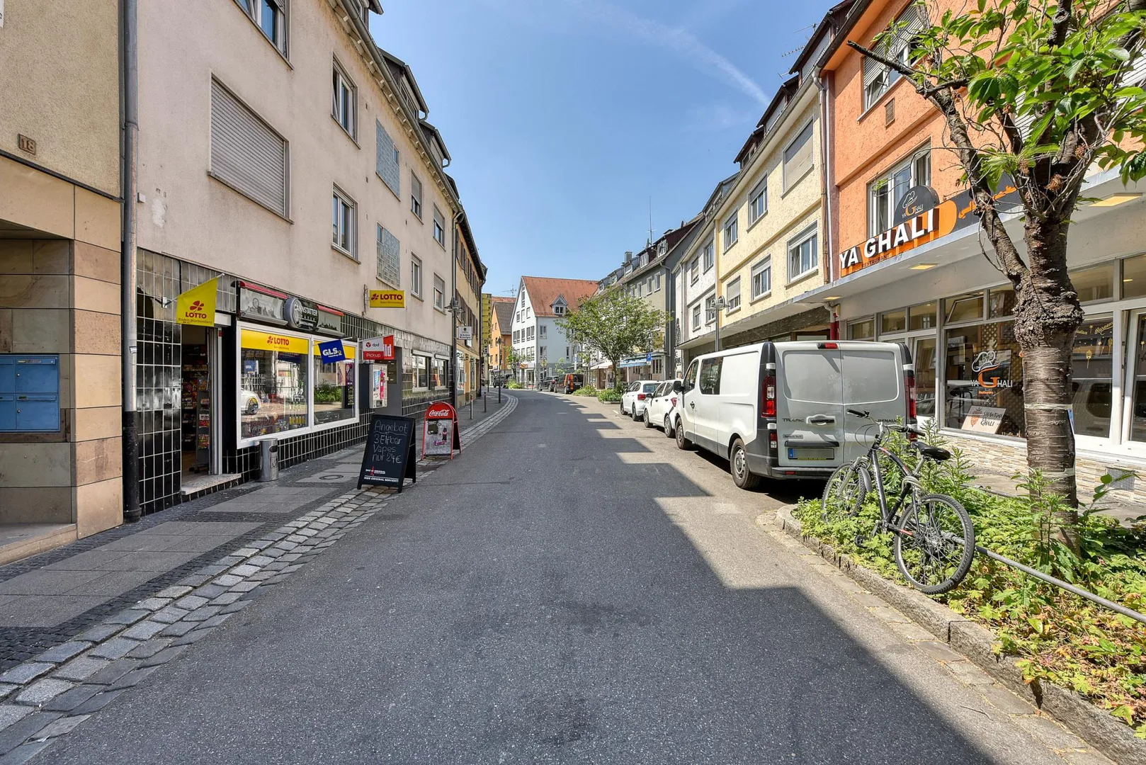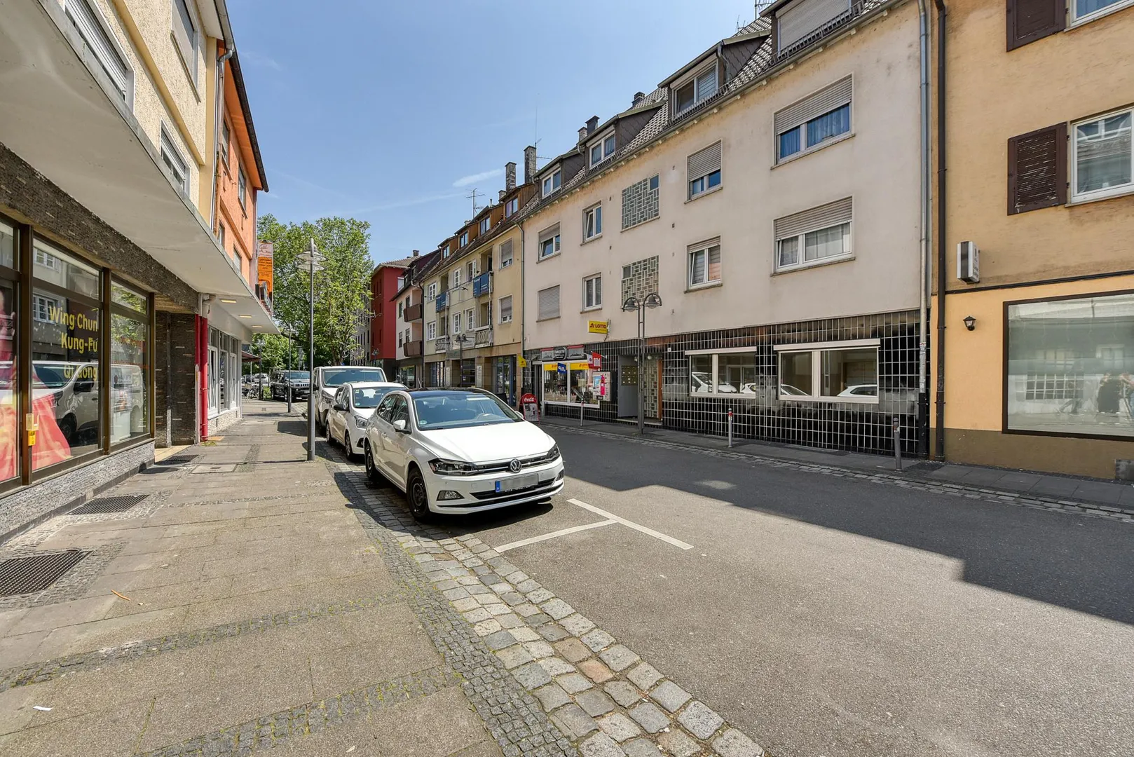 Diese zentral gelegene und renovierte 2-Zimmer-Wohnung mit gemeinschaftlicher Terrasse befindet sich im Erdgeschoss rechts eines Wohn- und Geschäfts-Reihen-Mittel-Hauses mit einem Kiosk im Erdgeschoss links sowie 10 Wohneinheiten.