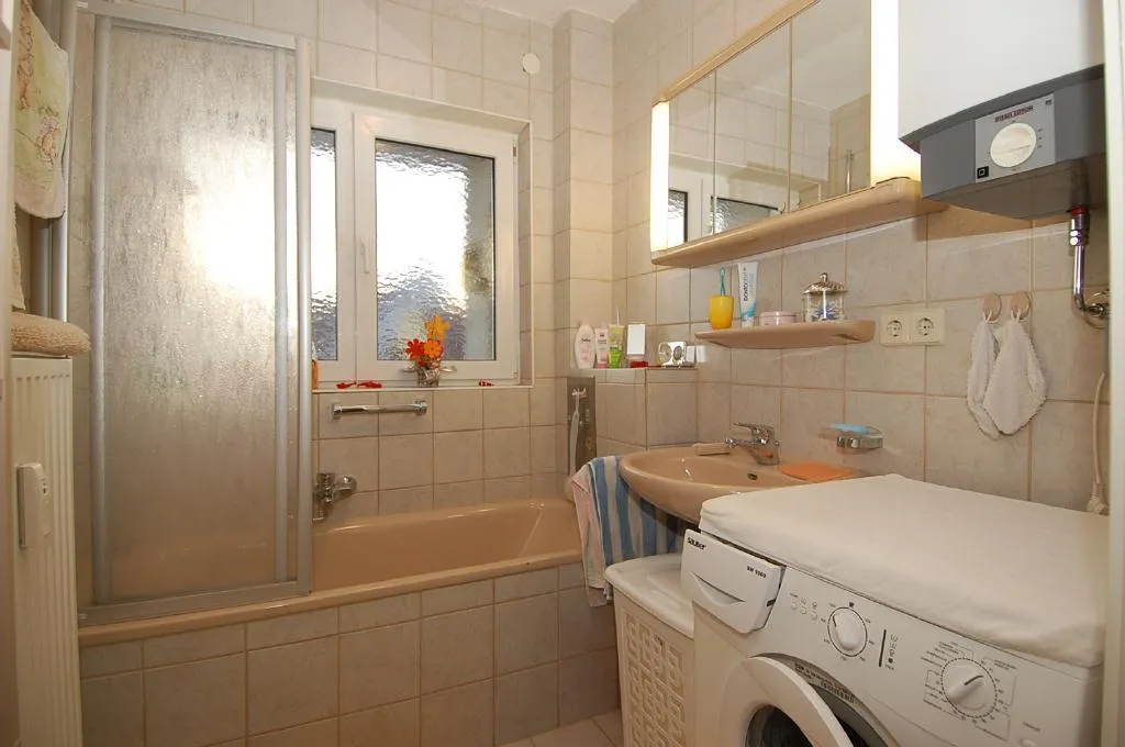 Es ist raumhoch gefliest und u.a. ausgestattet mit Badewanne, Waschmaschinenanschluß und Fenster.