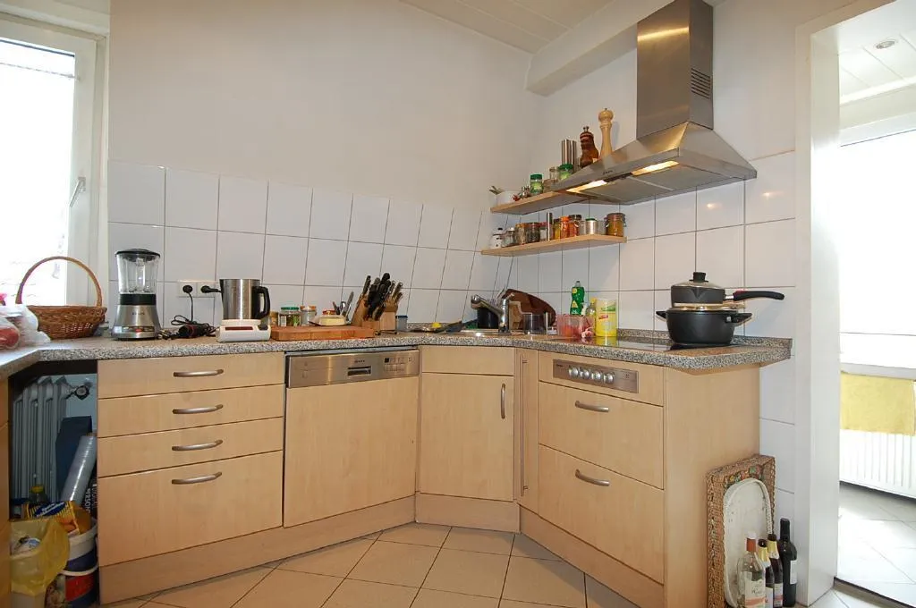 - Die Küche: Sie ist mit Fliesenboden ausgestattet und verfügt über eine moderne Einbauküche (von 2002, Geräte der Firma NEFF) mit Cerankochfeld und Backofen in Hüfthöhe, Außen-Dunstabzug, Geschirrspülmaschine, Kühlschrank, sehr gepflegten Einbaumöbeln und Halogen-Einbauleuchten in der Holzdecke. Neben der Küche befindet sich ein Raum für den separaten Gefrierschrank und die Waschmaschine.