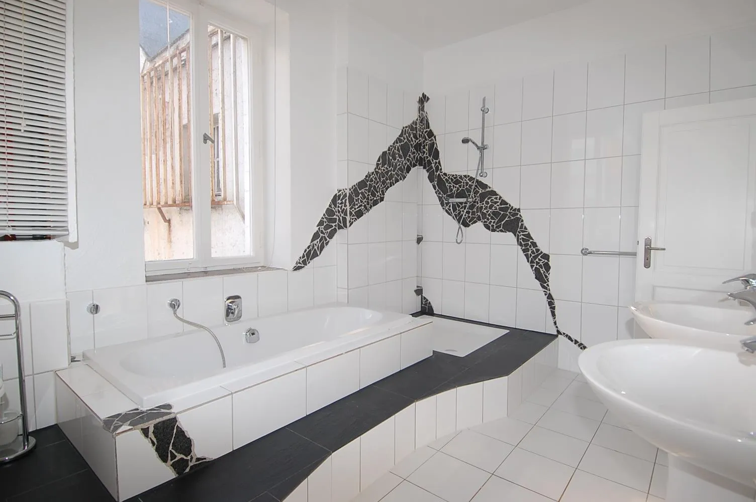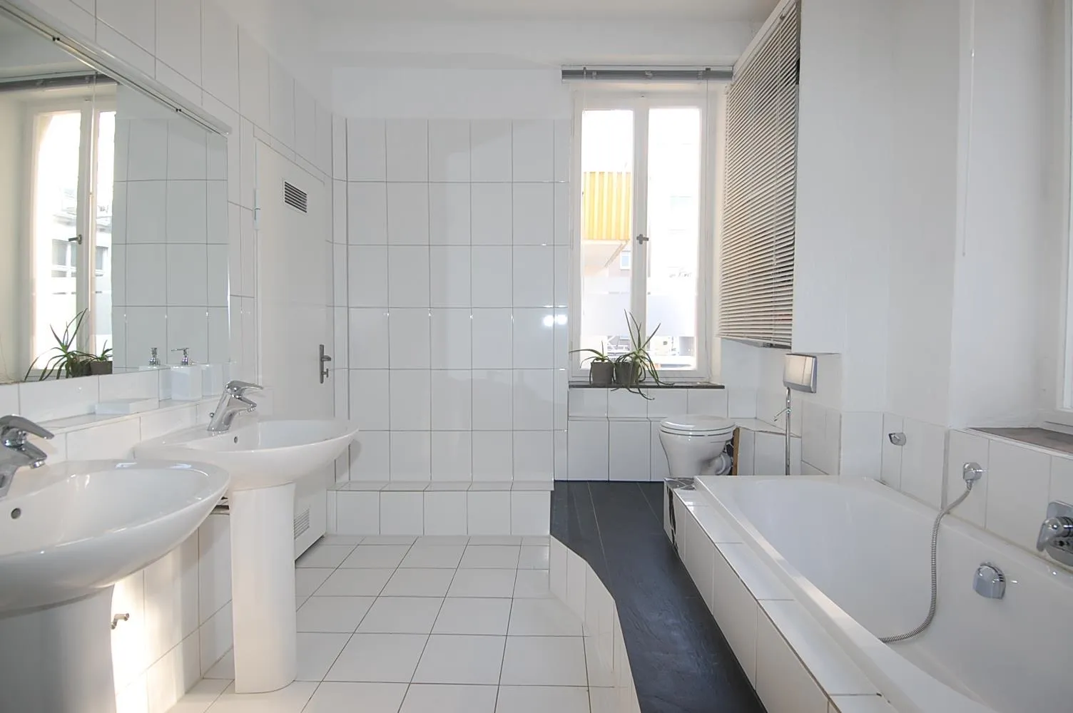 Das hochwertige Tageslichtbadezimmer von 2009 ist raumhoch gefliest und verfügt über eine Fußboden-Heizung, eine Wanne, eine Dusche, ein WC sowie 2 Waschbecken.