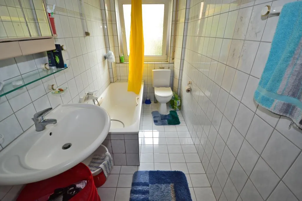 Das raumhoch geflieste Tageslicht-Badezimmer ist mit einer Badewanne sowie einem WC ausgestattet.