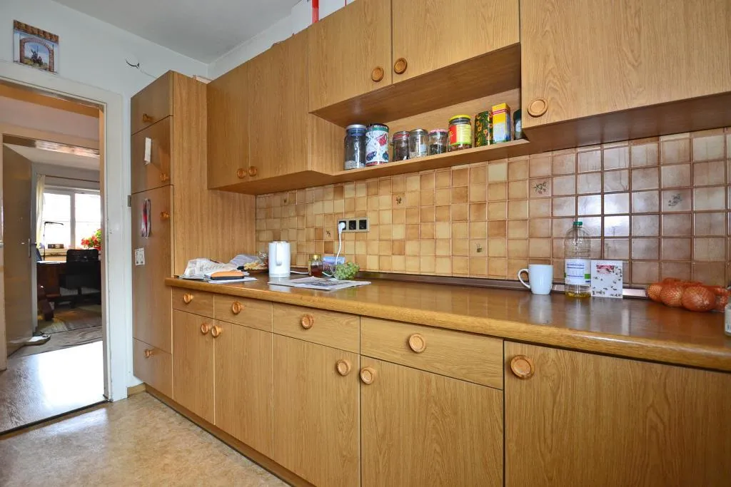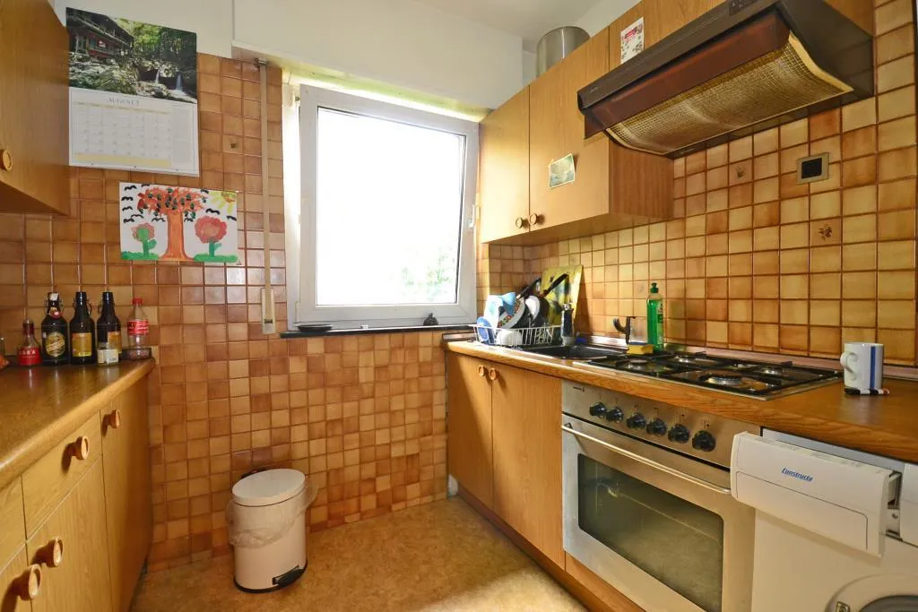 Die Küche ist mit einer älteren Einbauküche und einem Waschmaschinenanschluss ausgestattet. Die Einbauküche verfügt über einen Gas-Herd, einen Backofen mit Dunstabzug, einen Kühl- und Gefrierschrank sowie Ober- und Unterschränke.
