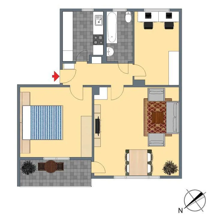Das Wohnzimmer und das Schlafzimmer sind nach Nord-Westen ausgerichtet. Die Küche, das Badezimmer und das Arbeitszimmer sind nach Süd-Osten ausgerichtet.