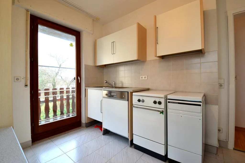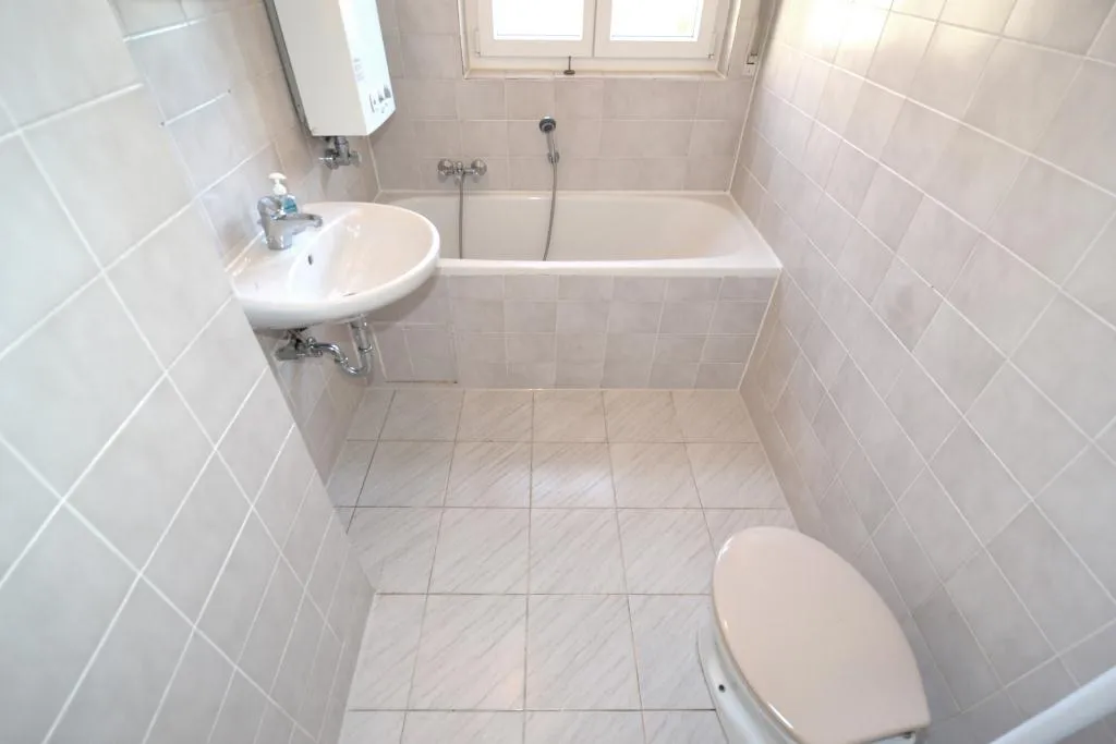 Die Böden in der Küche und im Badezimmer sind gefliest. Das raumhoch geflieste Badezimmer verfügt über eine Badewanne und ein WC.